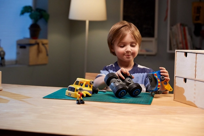 Žlutá odtahovka s funkčními díly je ideální pro první šroubování. Děti si procvičí koordinaci a hned poté vyrazí zachraňovat nepojízdná auta.