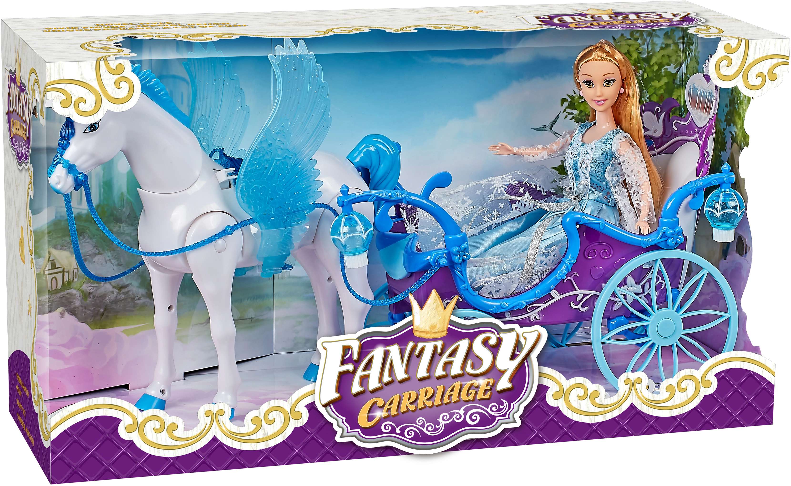 Objevte kouzelný svět s magickým modrým kočárem, Pegasem a panenkou, který nabízí světelné a zvukové efekty, pohádkový design a snadné ovládání pro nekonečné chvíle tvořivé hry.