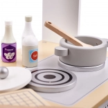 Stylová dřevěná dětská kuchyňka z MDF v neutrálních barvách přináší hodiny kreativní hry. Má kovový vyjímatelný dřez, plotýnky s otočnými knoflíky, troubu s okénkem a displejem, mikrovlnku i odkapávač na nádobí. Součástí je bohaté příslušenství ze dřeva (hrnec, pánev, talířky, nožík, lžíce, obracečka, kořenky) a praktické háčky a police pro uložení. Bezpečné, hladce broušené a natřené netoxickými barvami.