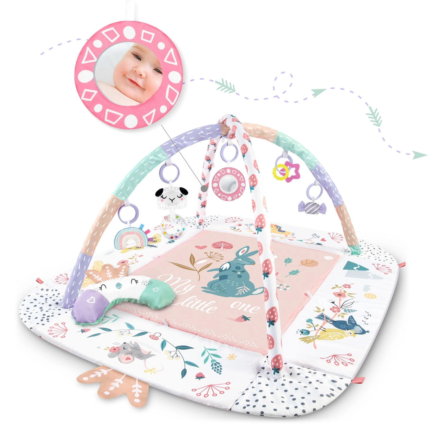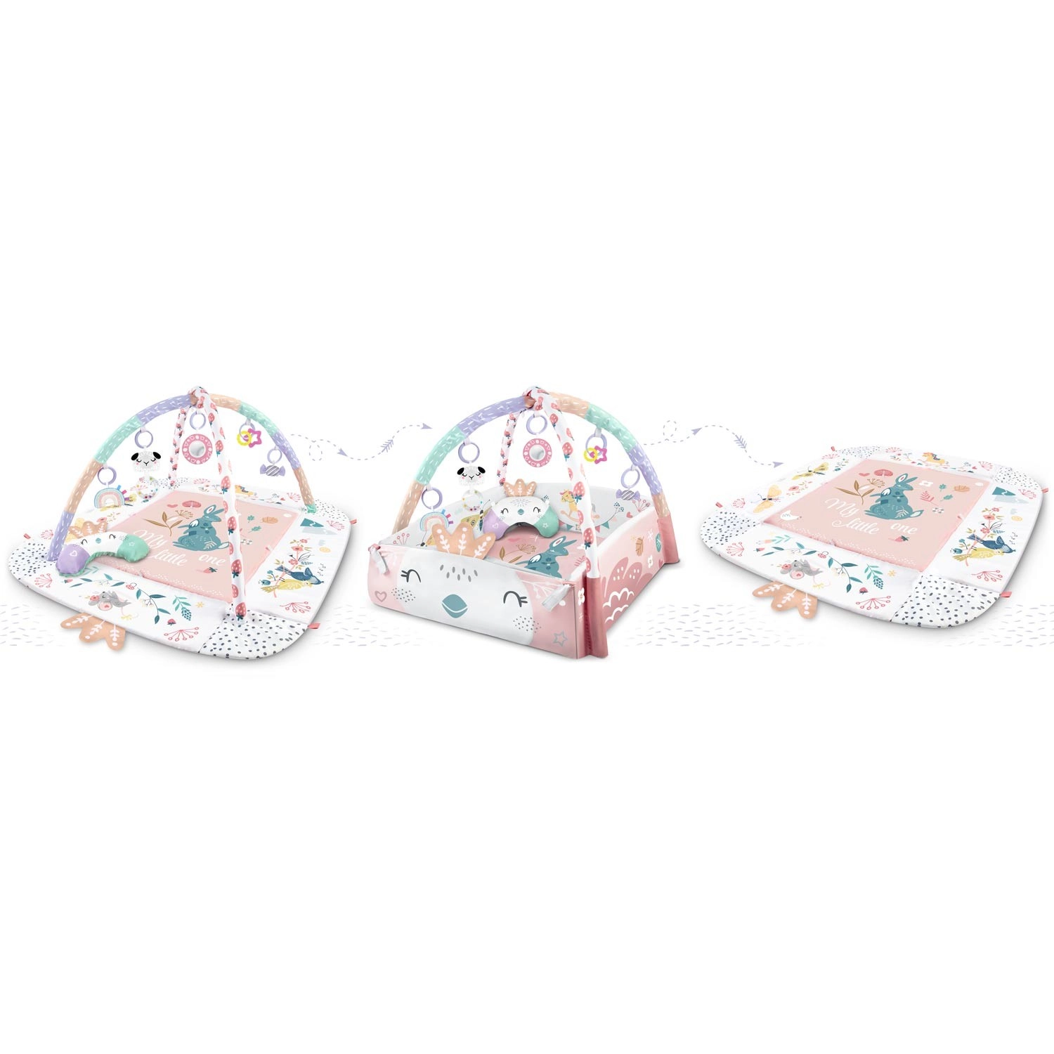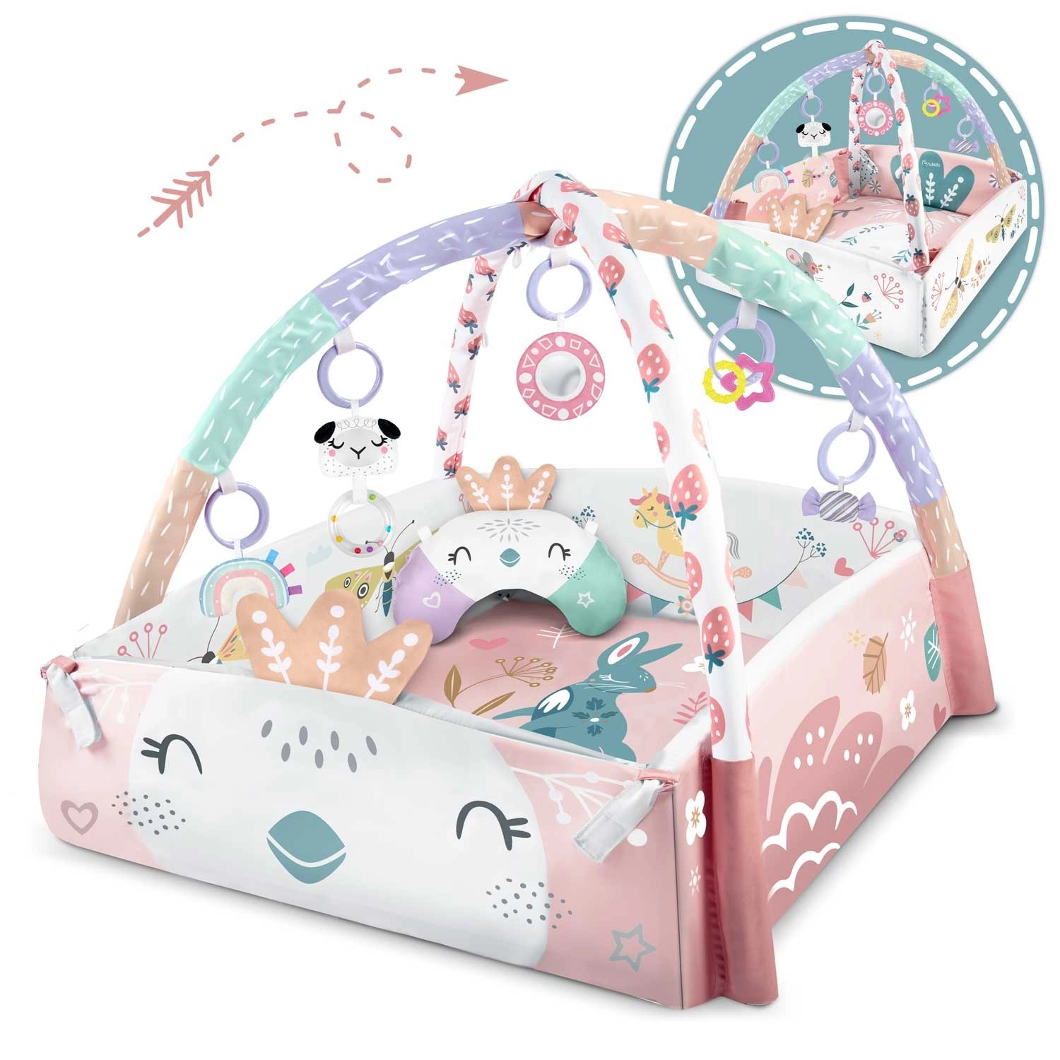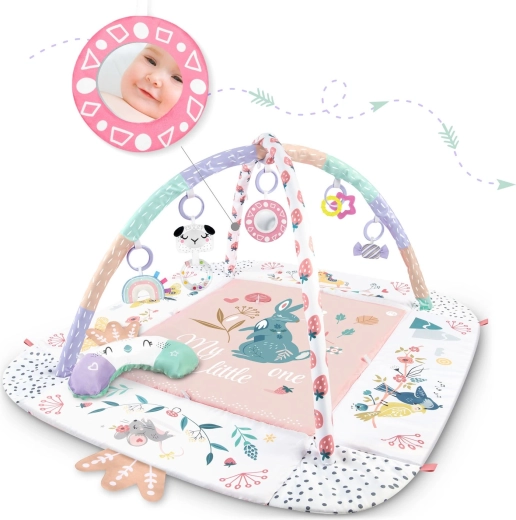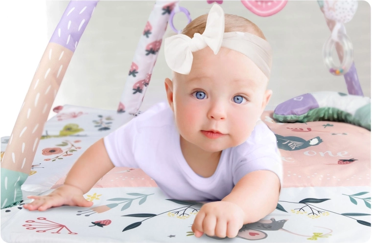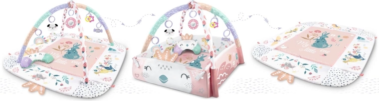 Materiál je měkký, odolný a snadno čistitelný, spodní strana skvěle izoluje od chladu. Pastelová, oboustranná grafika s motivem zvířátek vytváří příjemné prostředí pro každodenní hraní i odpočinek. Díky odnímatelným a výškově nastavitelným obloukům a chytrým páskům na suchý zip lze hračky snadno přemísťovat a přizpůsobit fázi vývoje dítěte.