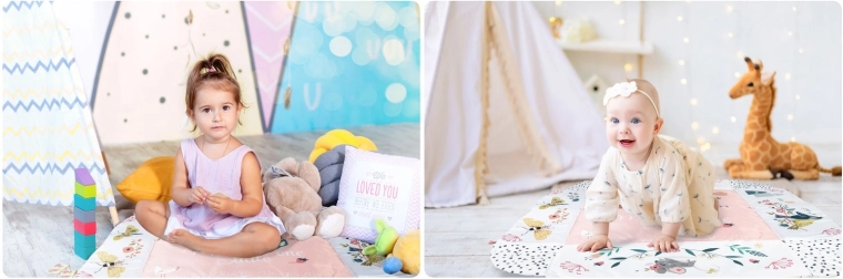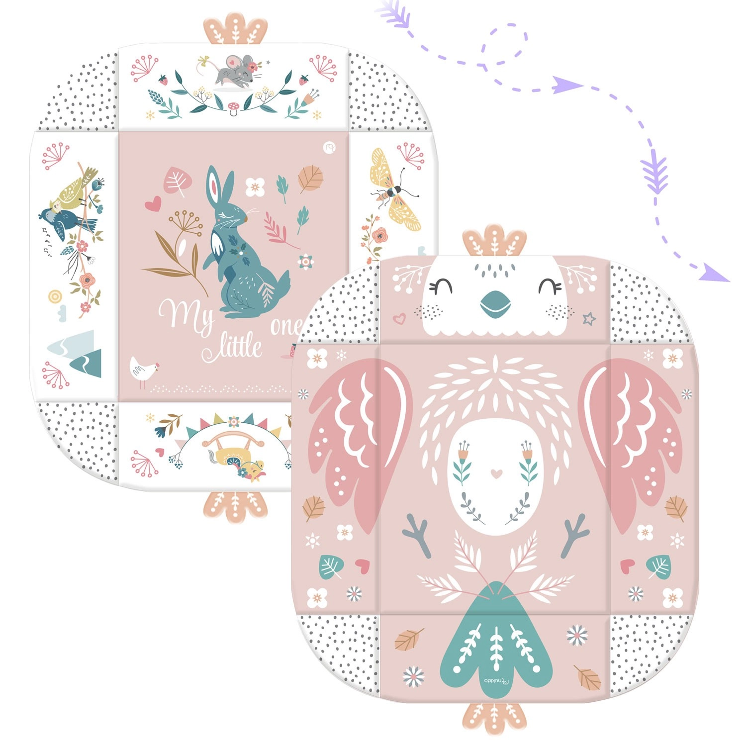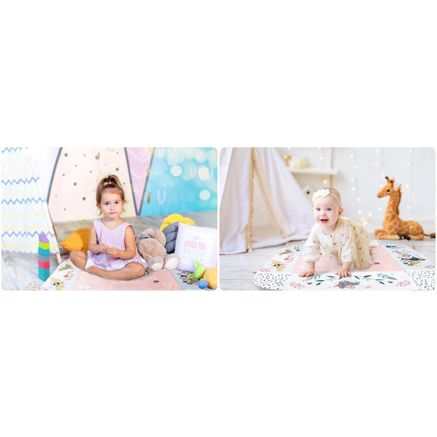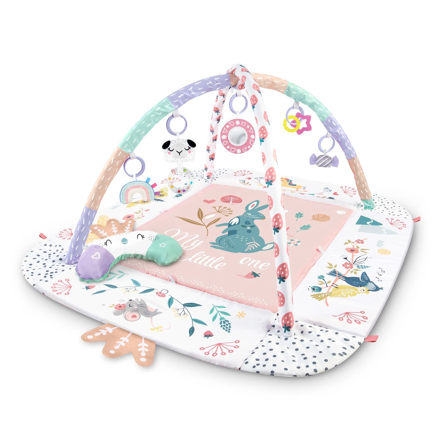 Materiál je měkký, odolný a snadno čistitelný, spodní strana skvěle izoluje od chladu. Pastelová, oboustranná grafika s motivem zvířátek vytváří příjemné prostředí pro každodenní hraní i odpočinek. Díky odnímatelným a výškově nastavitelným obloukům a chytrým páskům na suchý zip lze hračky snadno přemísťovat a přizpůsobit fázi vývoje dítěte.