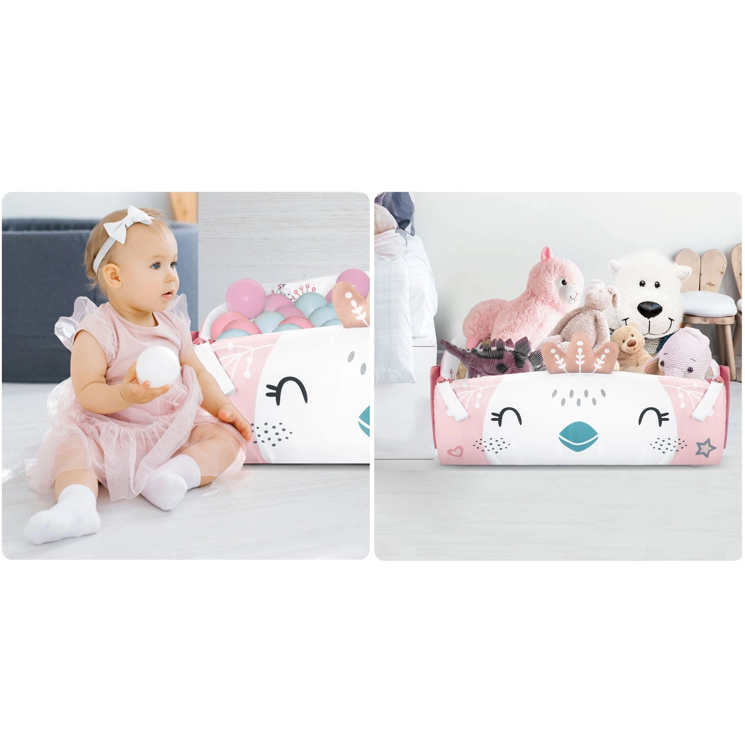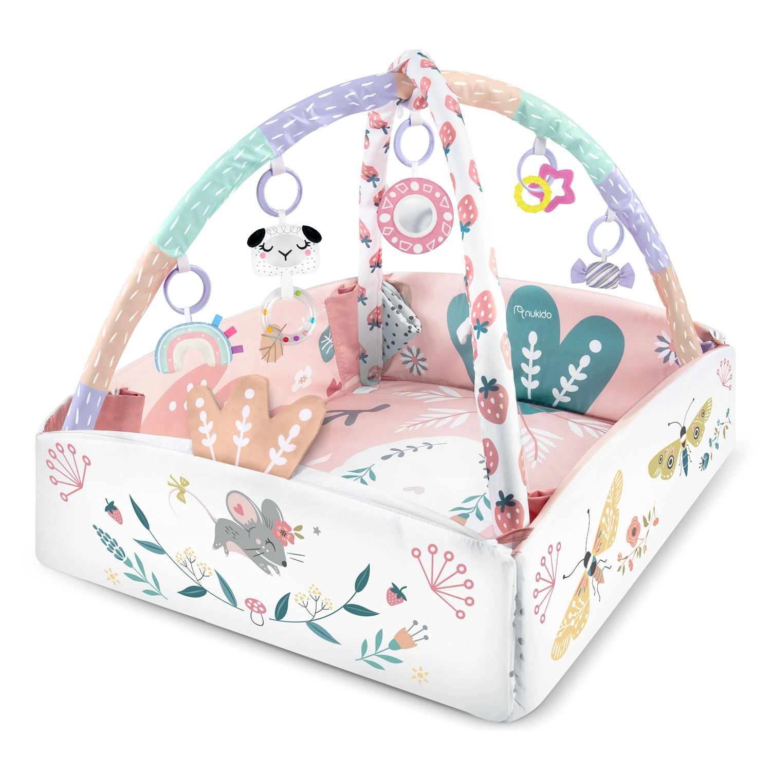 Objevte univerzální hrací deku NUKIDO, která roste s vaším děťátkem. Deka se dá použít ve 3 konfiguracích – jako otevřená podložka, s vyklápěcími bočnicemi pro bezpečnější herní koutek i jako útulný prostor pro první sezení a hraní. 7 závěsných hraček (zrcátko z netříštivého materiálu, chrastítka, šusticí a pískací prvky, kousátka) stimuluje zrak, sluch i hmat a podporuje jemnou motoriku.