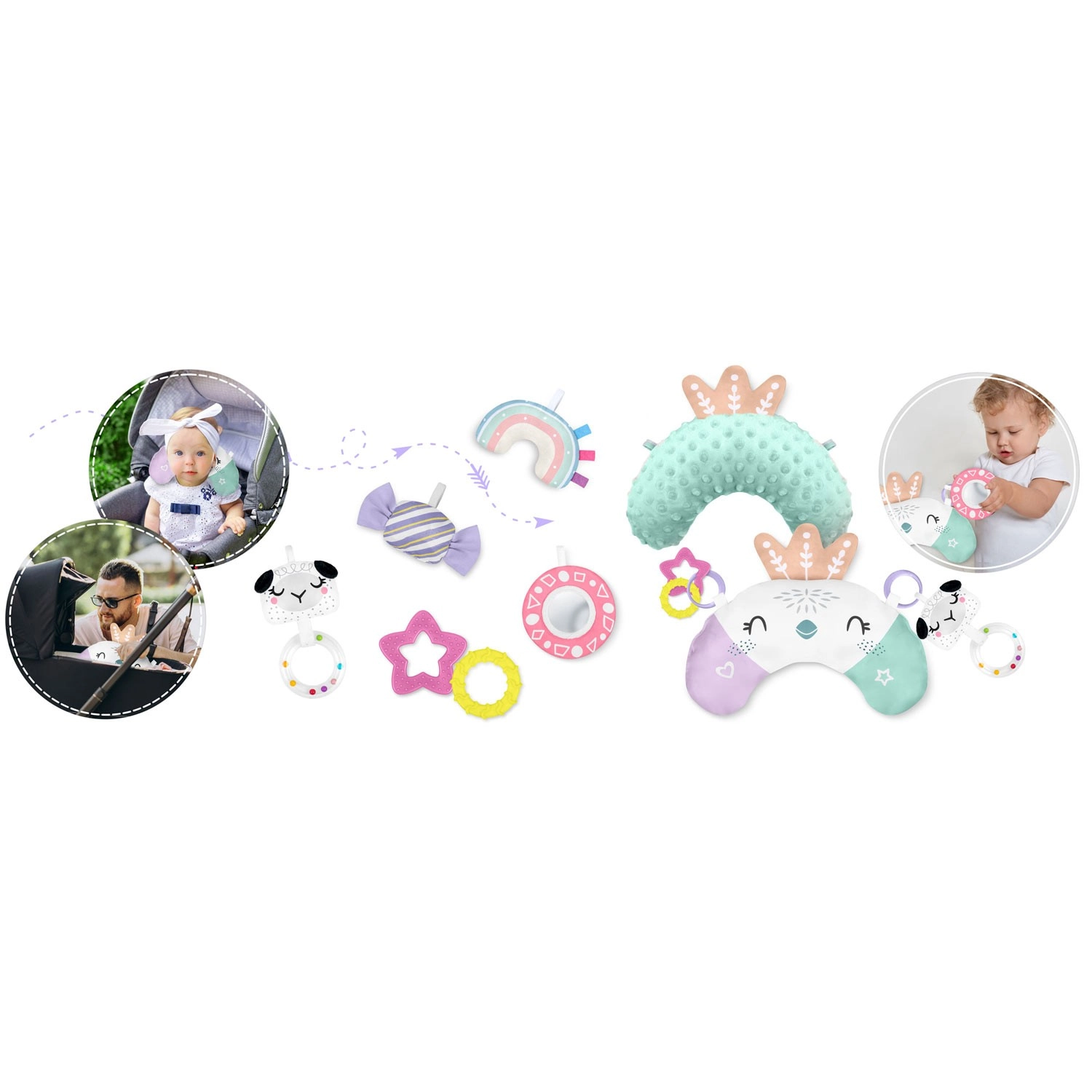 • Podpora vývoje: zrcátko pro sebepoznávání, různé textury a zvuky, motivace k pasení koníčků (tummy time) pomocí U polštářku v balení.