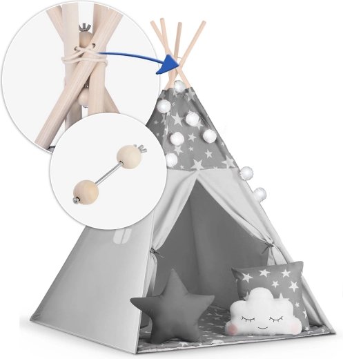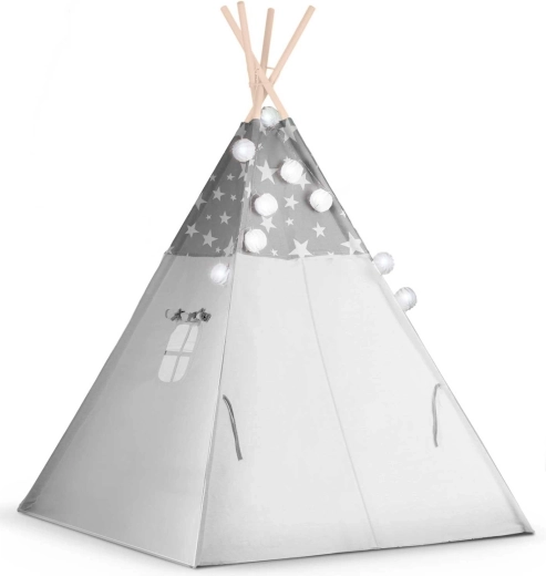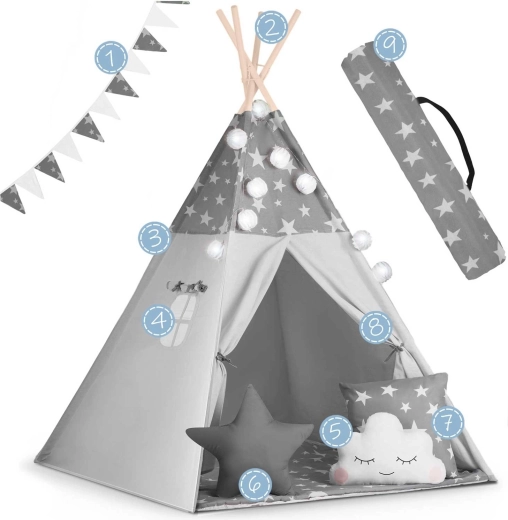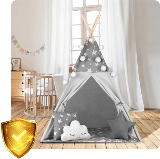 Vytvořte dětem jejich vlastní útulný koutek s teepee NUKIDO. Tento stylový stan v jemné šedé barvě s hvězdičkami je ušitý z prémiové bavlny, má stabilní dřevěnou konstrukci se stabilizátorem zdarma a součástí je měkká izolační podložka, 3 polštářky, girlanda, světýlka a přepravní obal. Snadno se skládá, skvěle větrá a je ideální pro hraní, čtení i odpočinek doma i na zahradě.