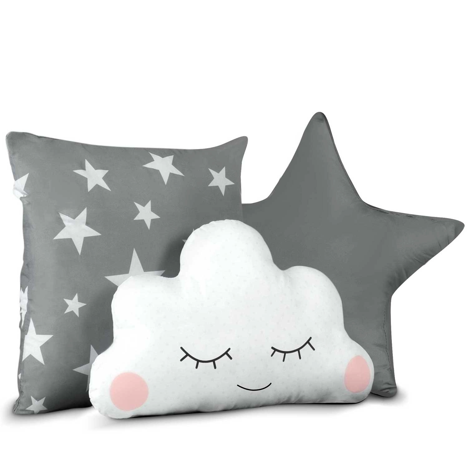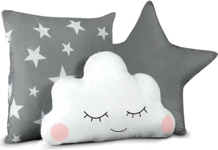 V balení najdete polstrovanou podložku, 3 polštářky, LED světýlka, girlandu a praktický obal – vše sladěné do šedé s hvězdičkami.
