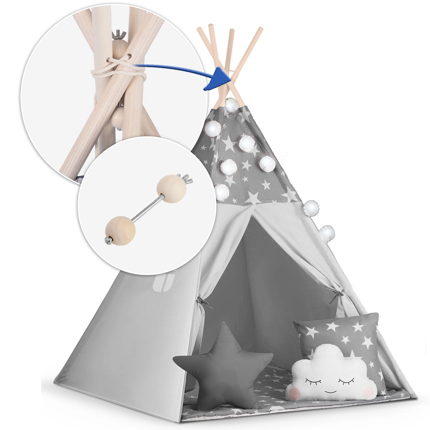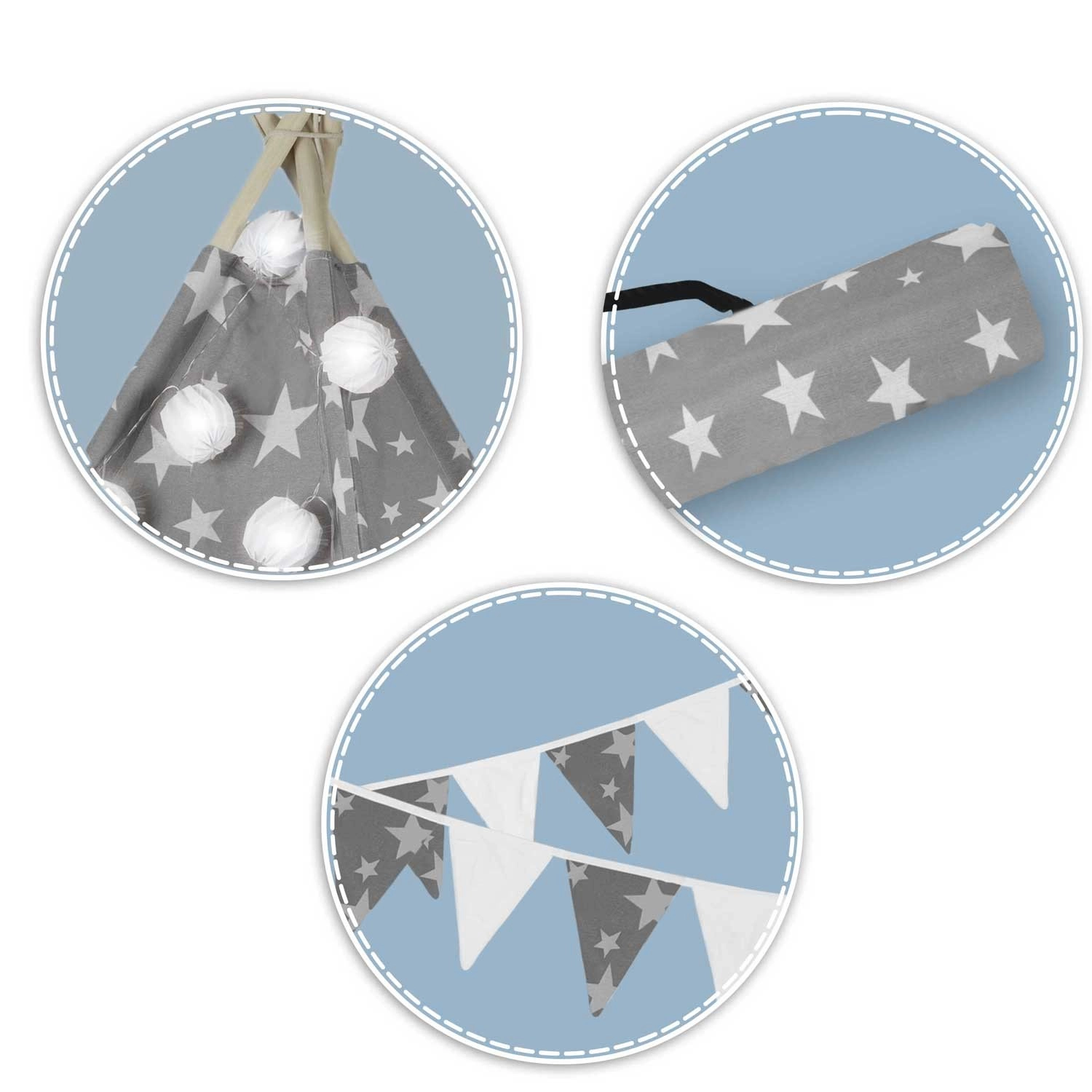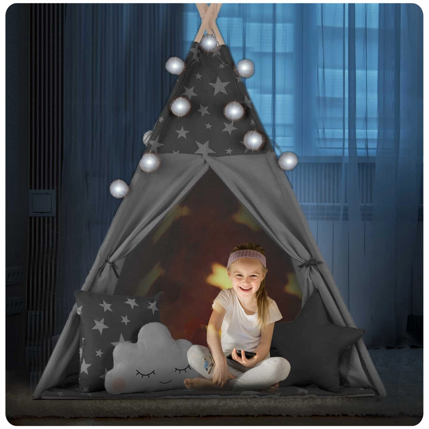 Pro maximální pohodlí je v balení polstrovaná izolační podložka s protiskluzovou úpravou a tři dekorativní polštářky. O atmosféru se postarají LED světýlka a girlanda, zatímco rolovací okenko a svazovací vchody umí kouzlit s prostorem a světlem. Po složení zabere teepee minimum místa a v přiloženém obalu jej snadno přenesete.