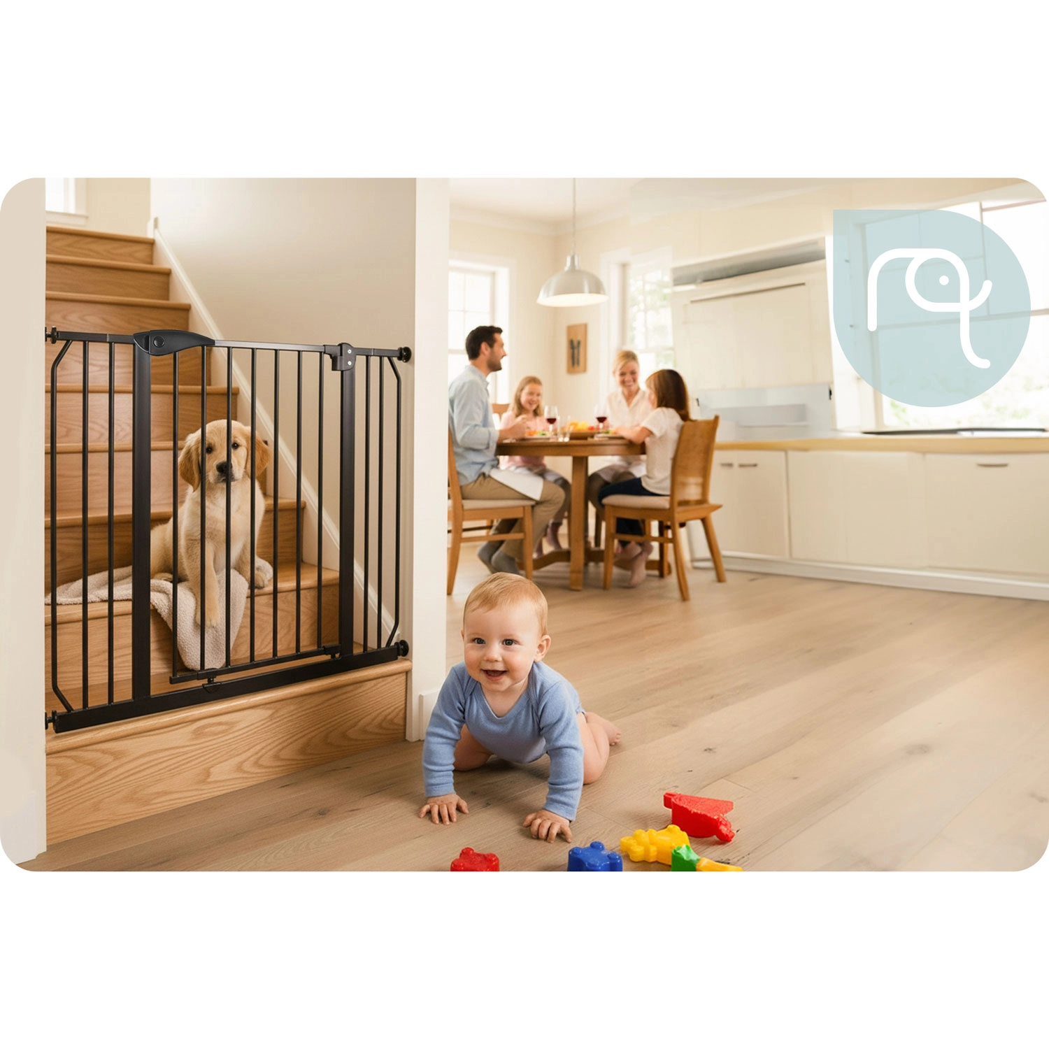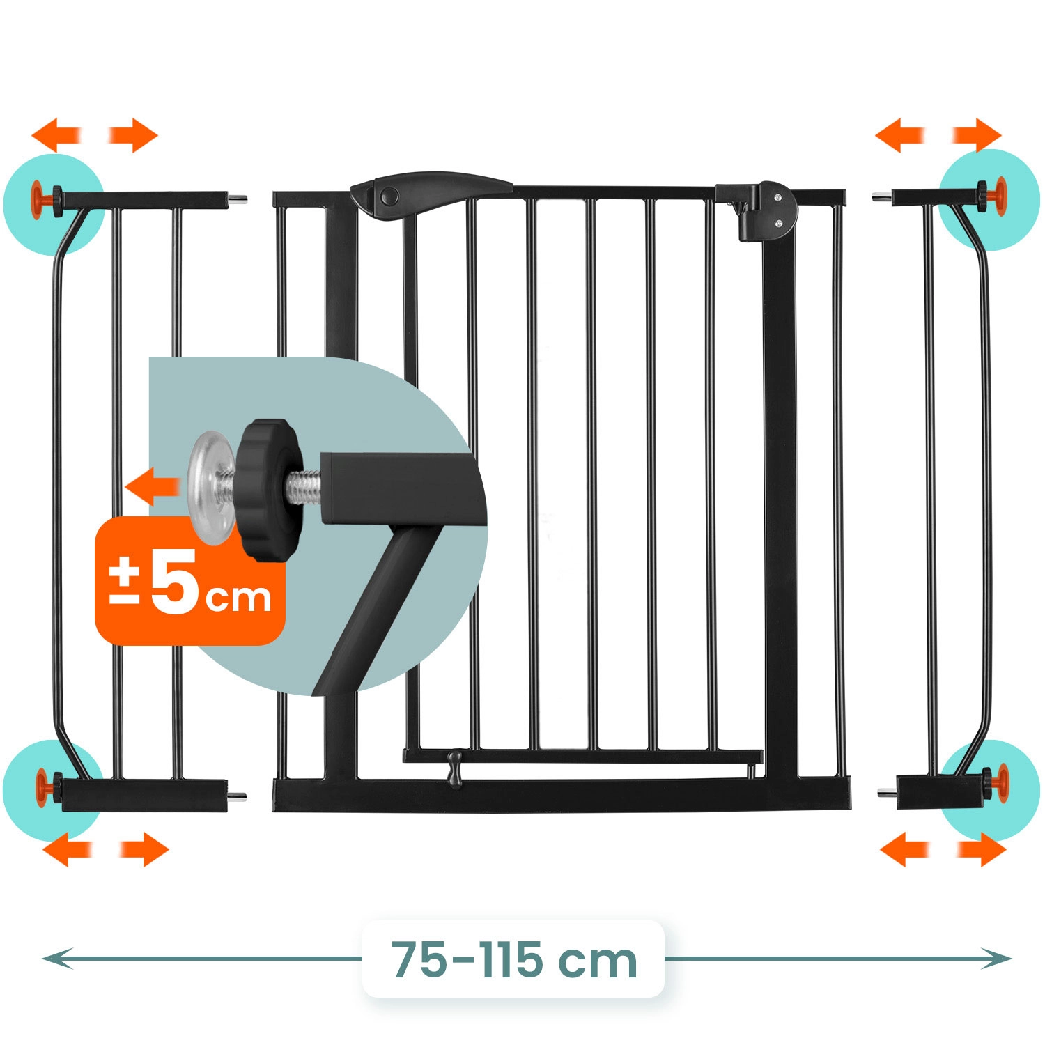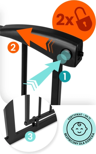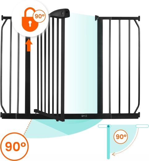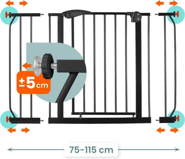 Pohodlí pro rodiče, jistota pro děti: branku otevřete jednou rukou, tiché zavírání s automatickým západkou zajistí bezpečné dovření. Dvojité zabezpečení znemožní náhodné otevření dítětem a obousměrný chod můžete v případě potřeby zablokovat na jeden směr. Praktické prodloužení v balení umožní přesné přizpůsobení průchodu 75–115 cm.