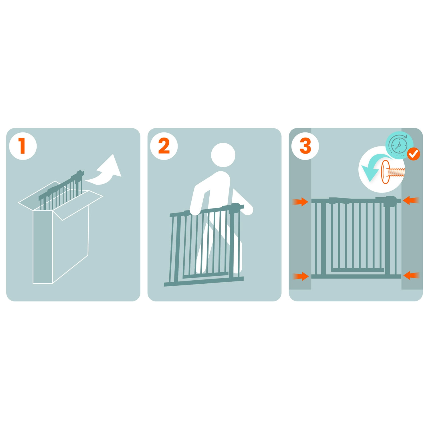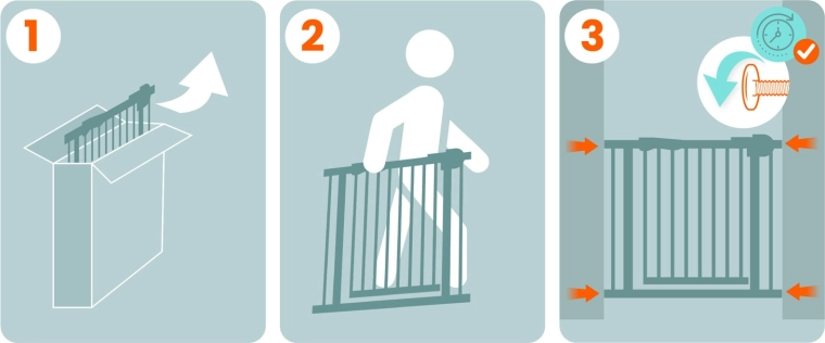V balení najdete 2 prodloužení (10 a 20 cm) a regulační šrouby. Branku snadno přizpůsobíte dveřím, chodbám i spodku schodiště.