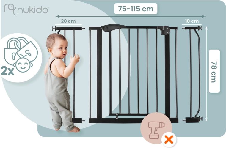 Bezpečnostní branka Nukido v elegantní černé barvě chrání děti i domácí mazlíčky a zachová volný průchod pro dospělé. Rozpěrná montáž bez vrtání nepoškodí stěny ani zárubně. Nastavitelná šířka 75–115 cm, výška 78 cm, otevírání jednou rukou, obousměrné otevírání s možností blokace na jednu stranu a dvojité jištění pro vyšší bezpečnost.