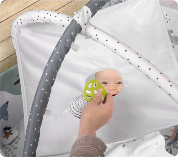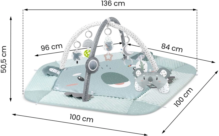 Velkorysý rozměr 136 × 136 cm zajistí dostatek prostoru i pro dvojčata. Deka má zvedací strany se suchými zipy pro vytvoření měkkého mantinelu, nastavitelné a odnímatelné hrazdičky a hračky (chrastítka, šustítka, pískátko, zrcátko z nerozbitného materiálu). Tři smyslové kapsičky na obrázky podporují zrakovou stimulaci a rozvoj poznávání.