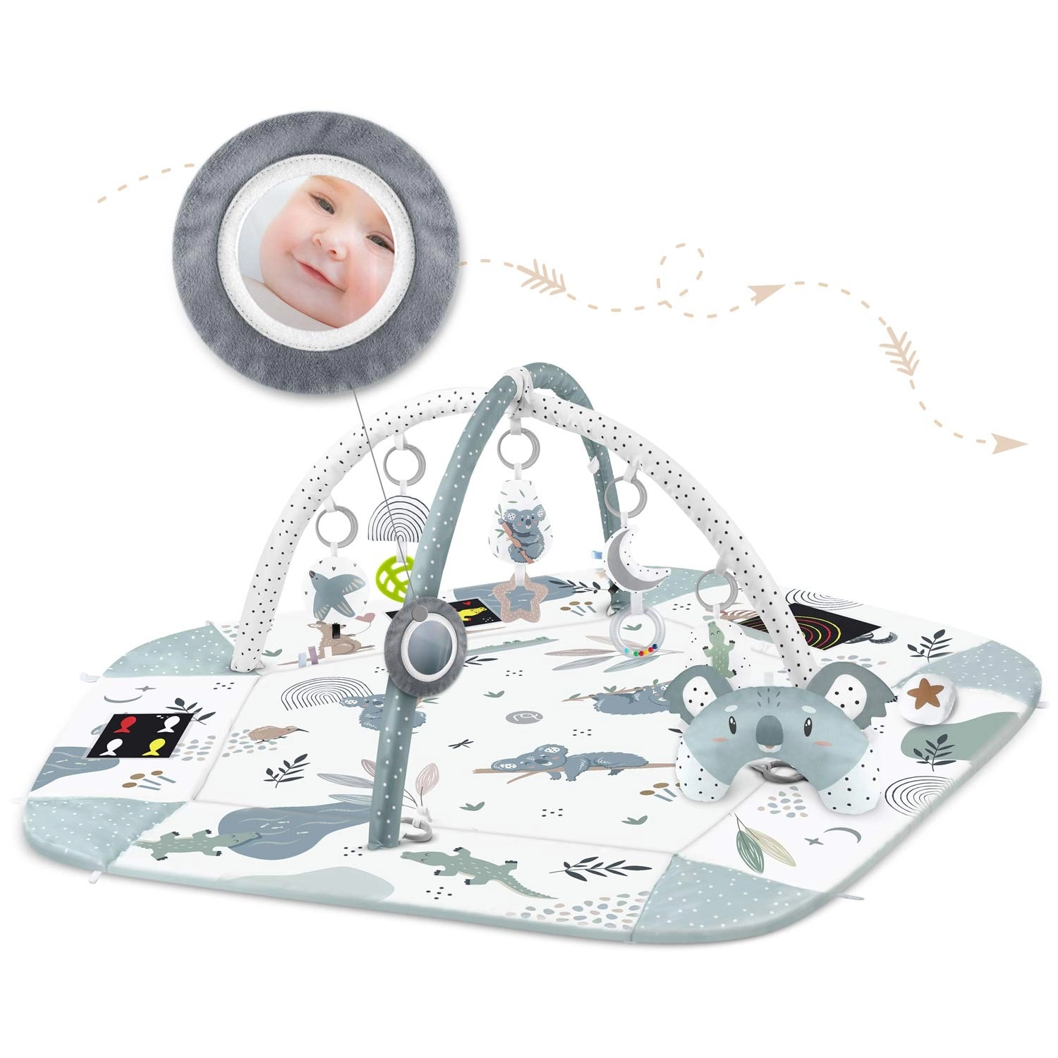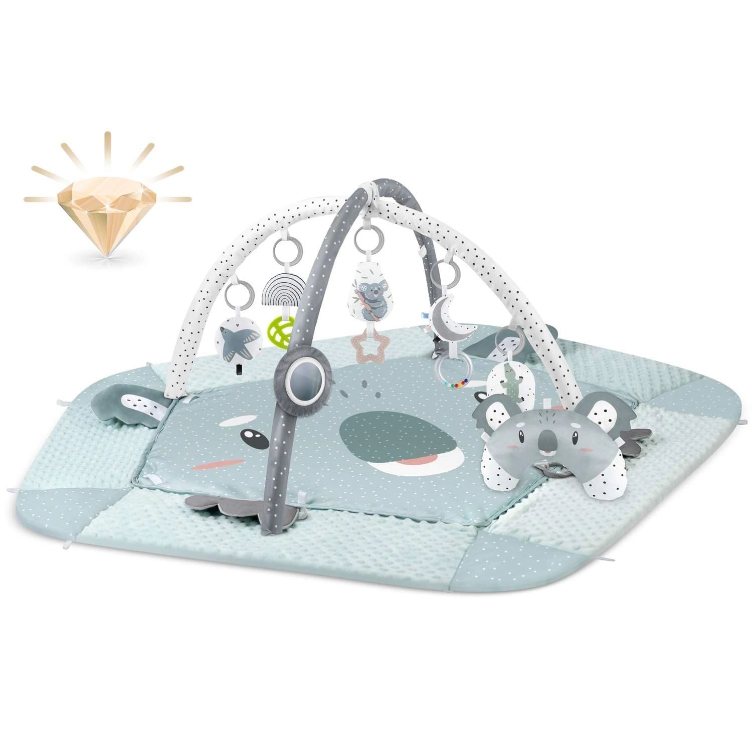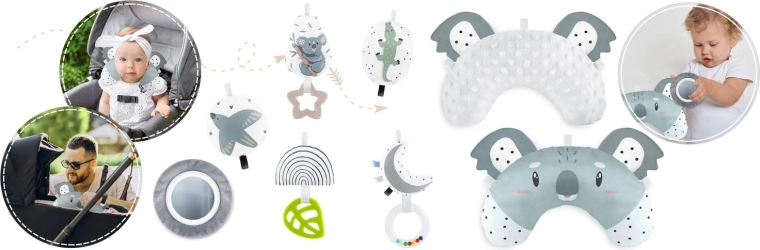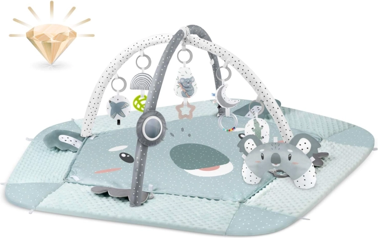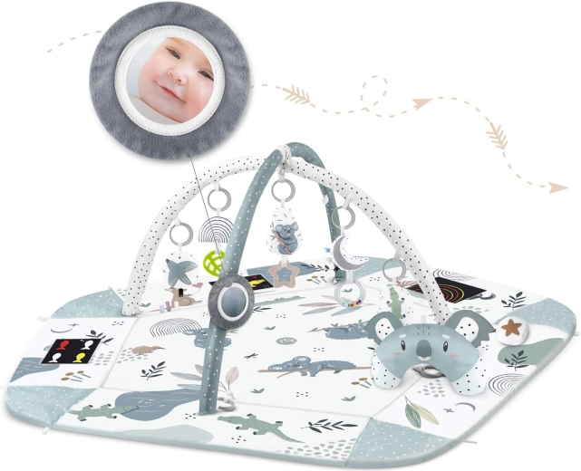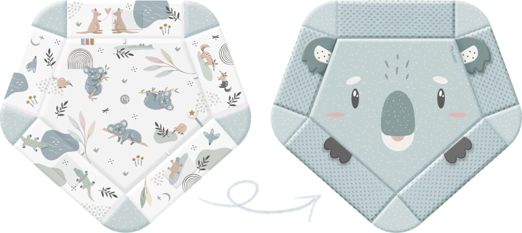 Díky oboustrannému provedení a snadnému skládání je ideální na doma i na cesty. Měkký povrch z minky a polyesteru je hebký na dotek a snadno se udržuje. Součástí je i polštářek pro břišní time s šustícími oušky koaly a speciální peekaboo podložka “A‑KU‑KU” pro hru na schovávanou, která rozvíjí pochopení stálosti předmětu.