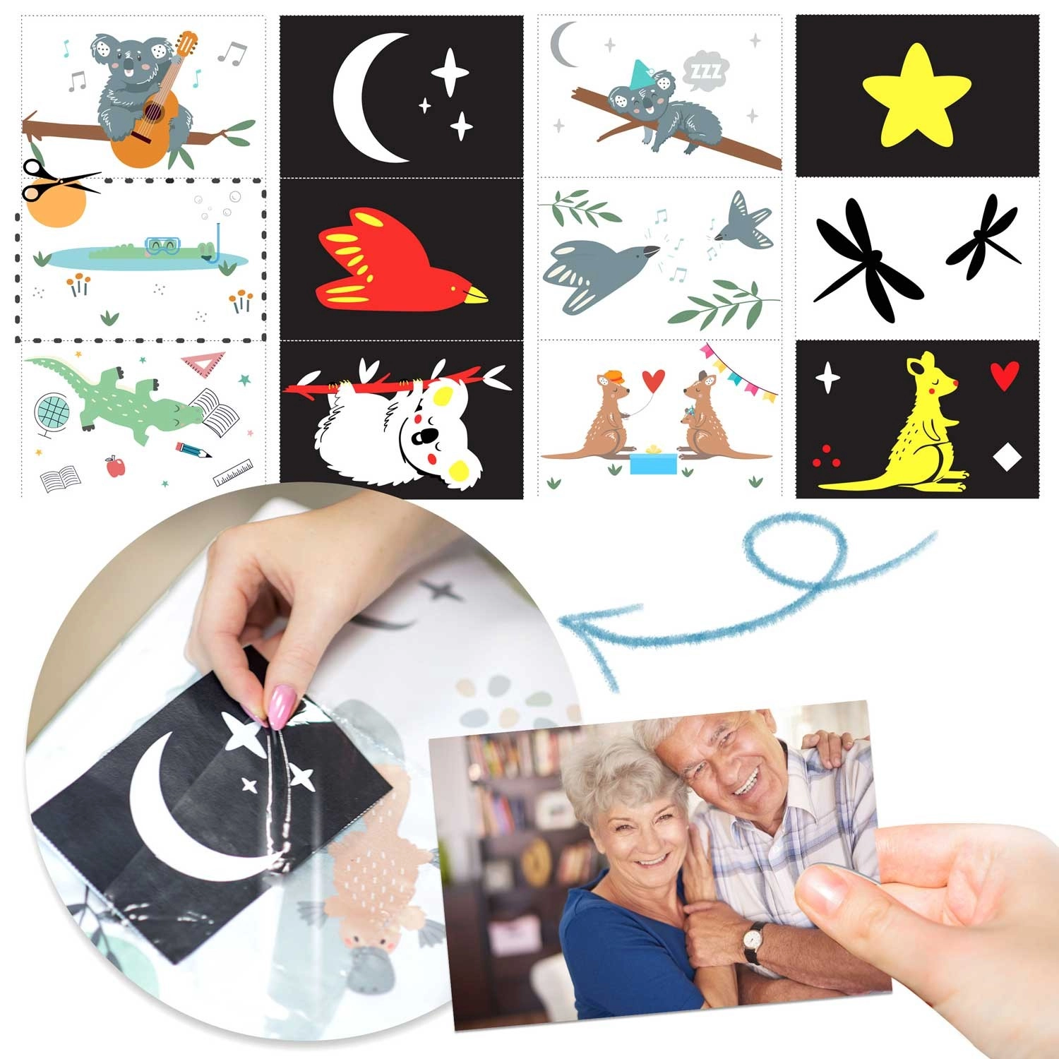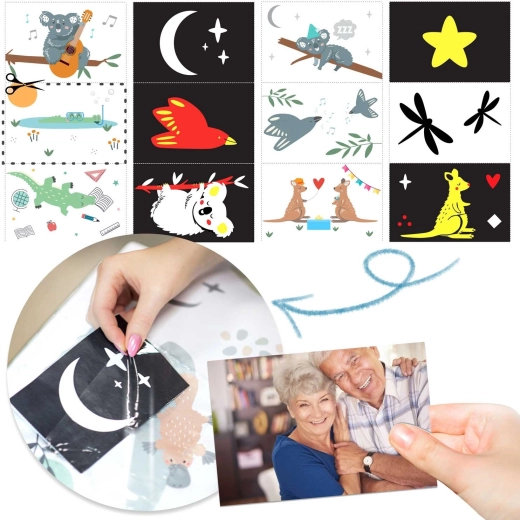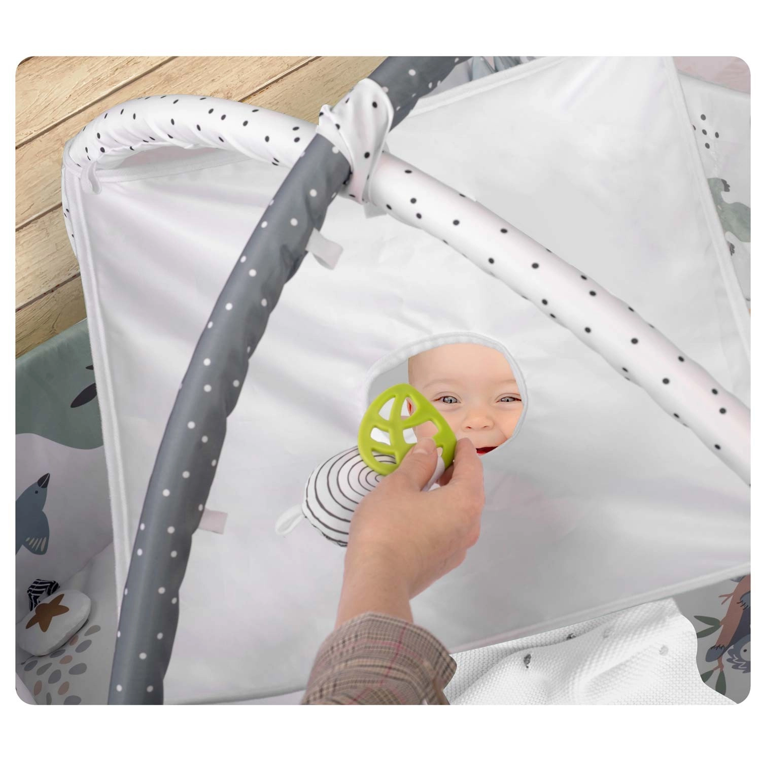 Zrcátko z nerozbitného materiálu, chrastítka, šustítka, pískátko i 3 kapsy na karty a fotky stimulují zrak, sluch i úchop.