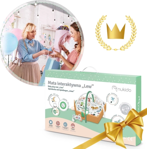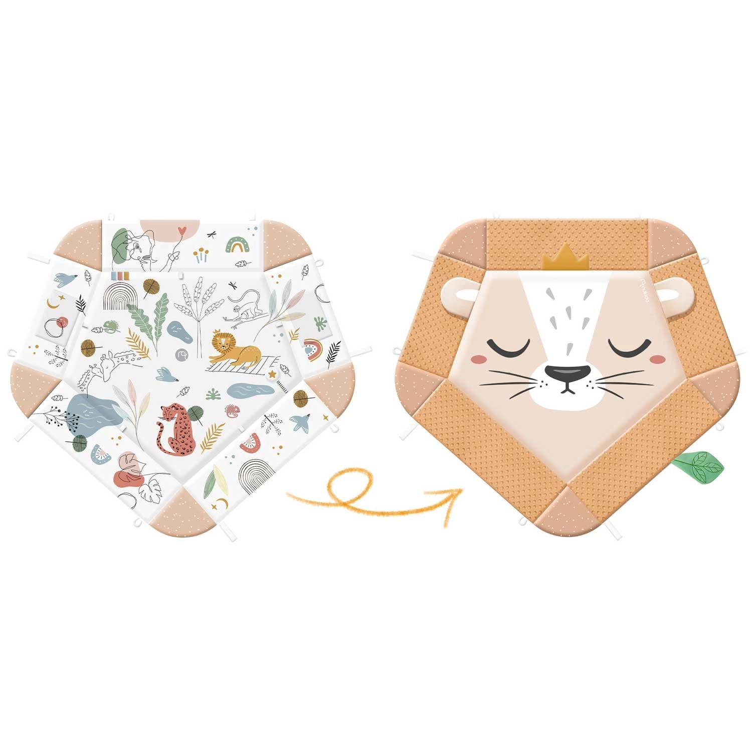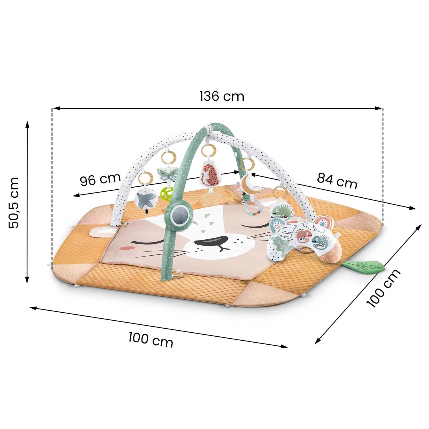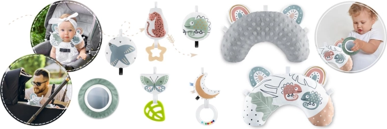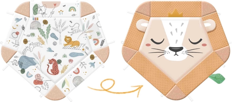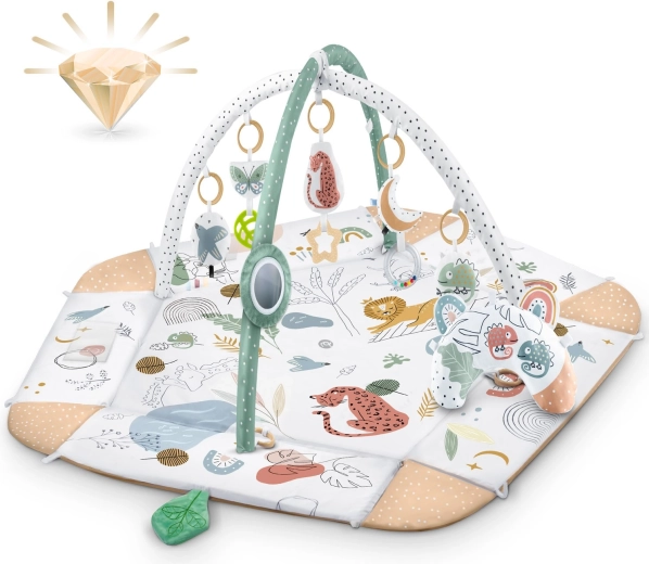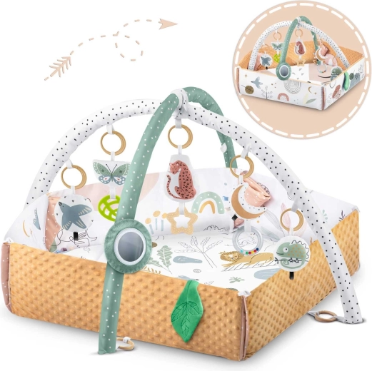 Součástí balení je 7 odnímatelných hraček (chrastítka, šustící prvky, pískací zvířátko, zrcátko z netříštivého materiálu aj.) a polštářek zdarma s hebkým povrchem typu minky – ideální pro pohodlné ležení na bříšku. Zvedací boky se zapínáním na suchý zip vytvářejí útulnou zónu, oblouky i hračky lze snadno přemístit či výškově upravit. Materiály jsou měkké, příjemné na dotek a snadno čistitelné.