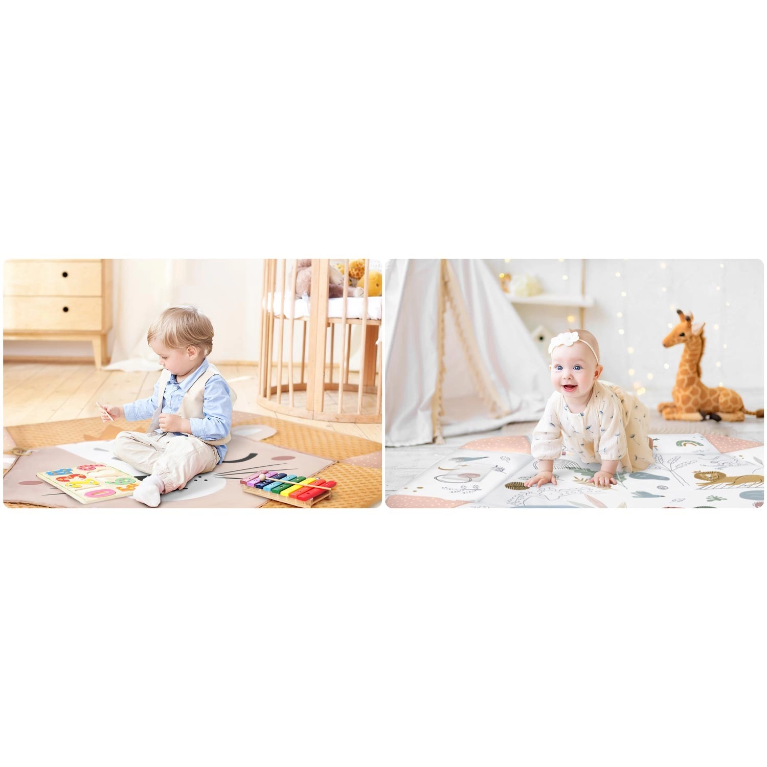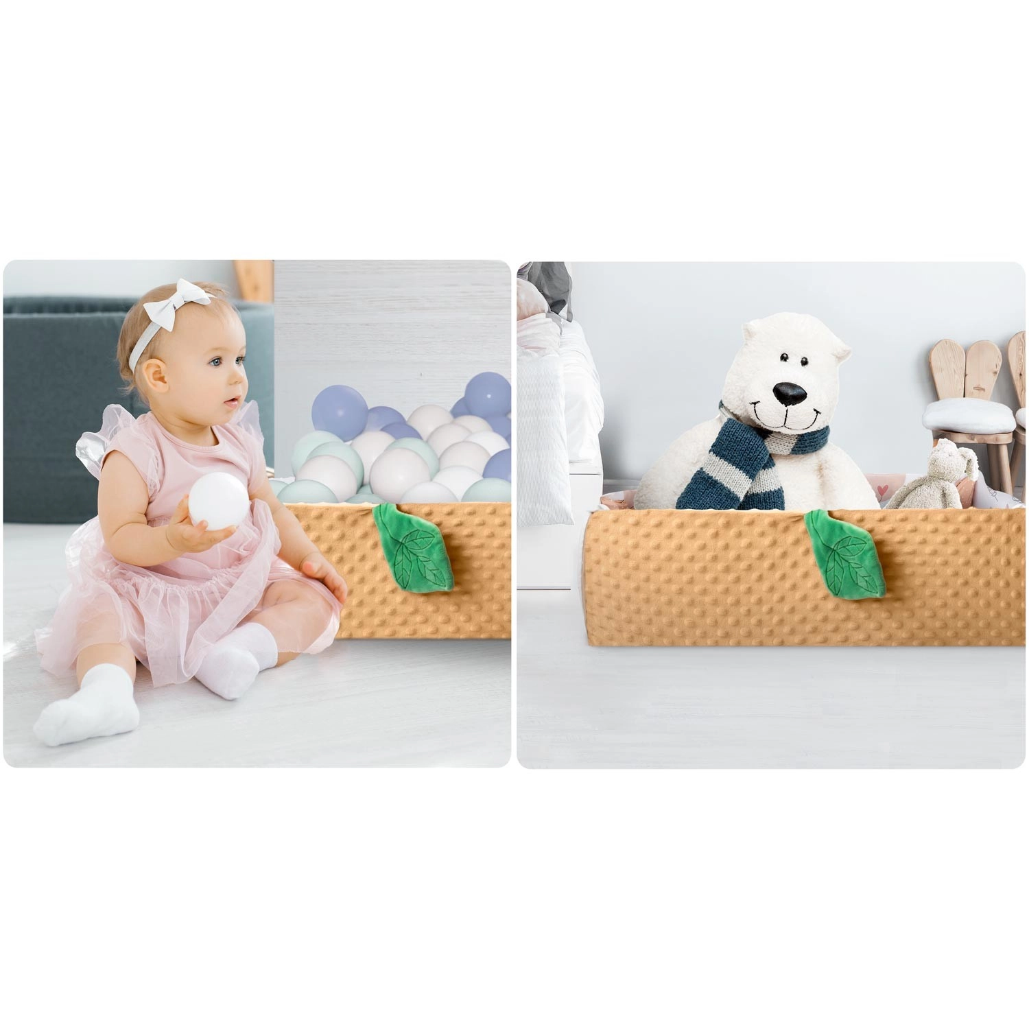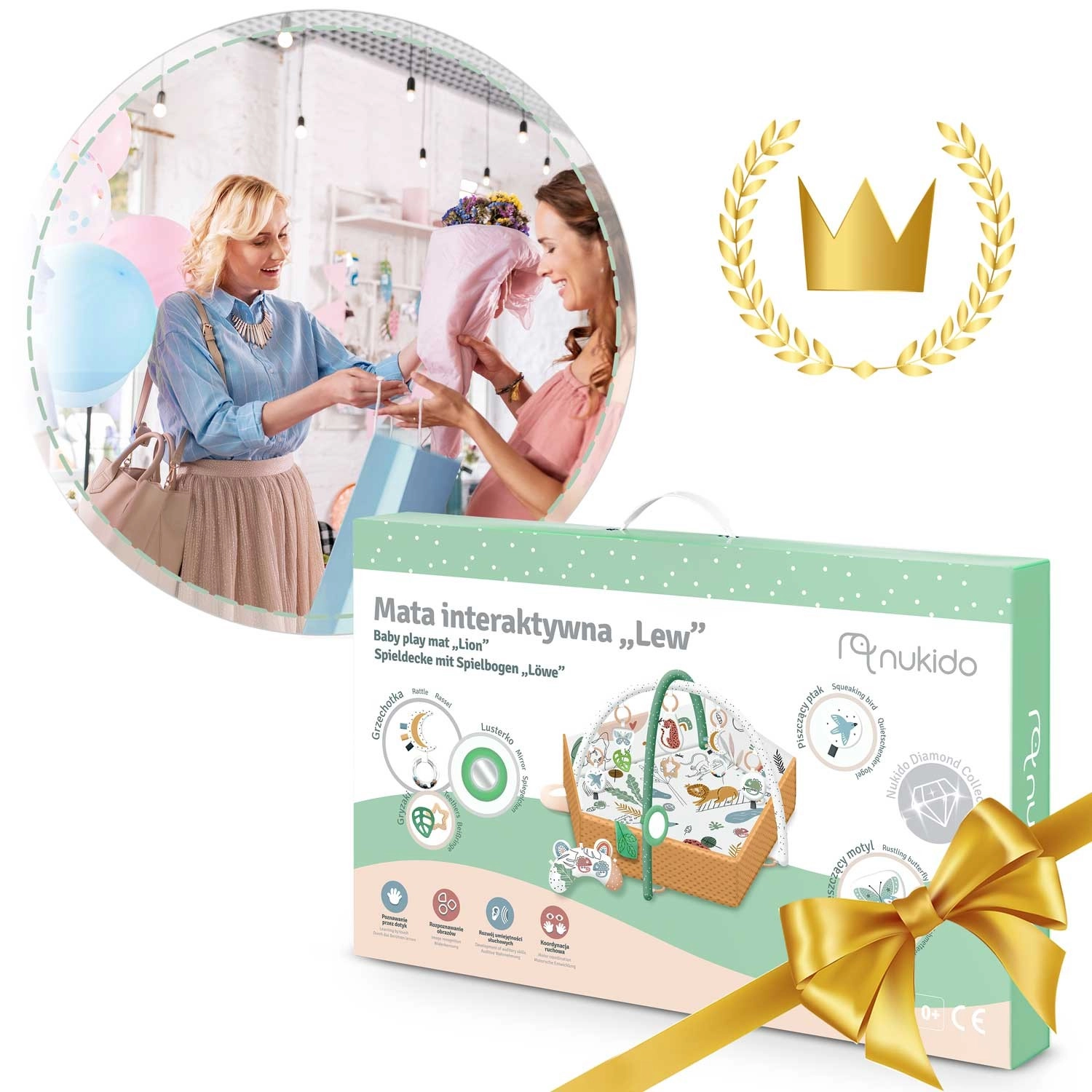 Součástí balení je 7 odnímatelných hraček (chrastítka, šustící prvky, pískací zvířátko, zrcátko z netříštivého materiálu aj.) a polštářek zdarma s hebkým povrchem typu minky – ideální pro pohodlné ležení na bříšku. Zvedací boky se zapínáním na suchý zip vytvářejí útulnou zónu, oblouky i hračky lze snadno přemístit či výškově upravit. Materiály jsou měkké, příjemné na dotek a snadno čistitelné.