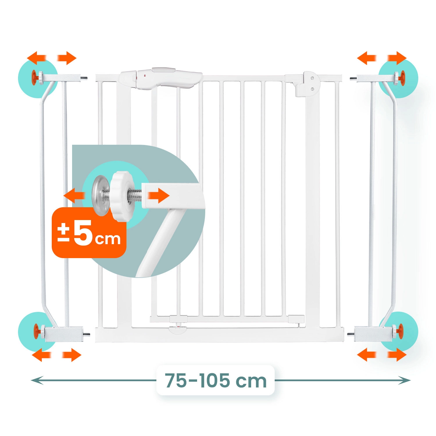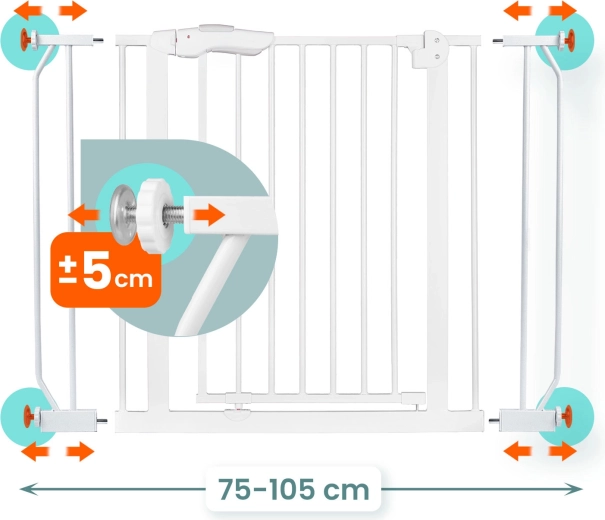 Součástí balení jsou prodloužení a regulátory šířky, díky nimž zábranu snadno nastavíte na průchody o šířce 75–105 cm. Ideální do dveří i na začátek či konec schodiště.