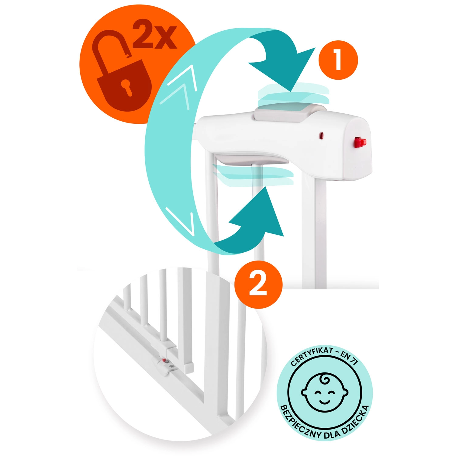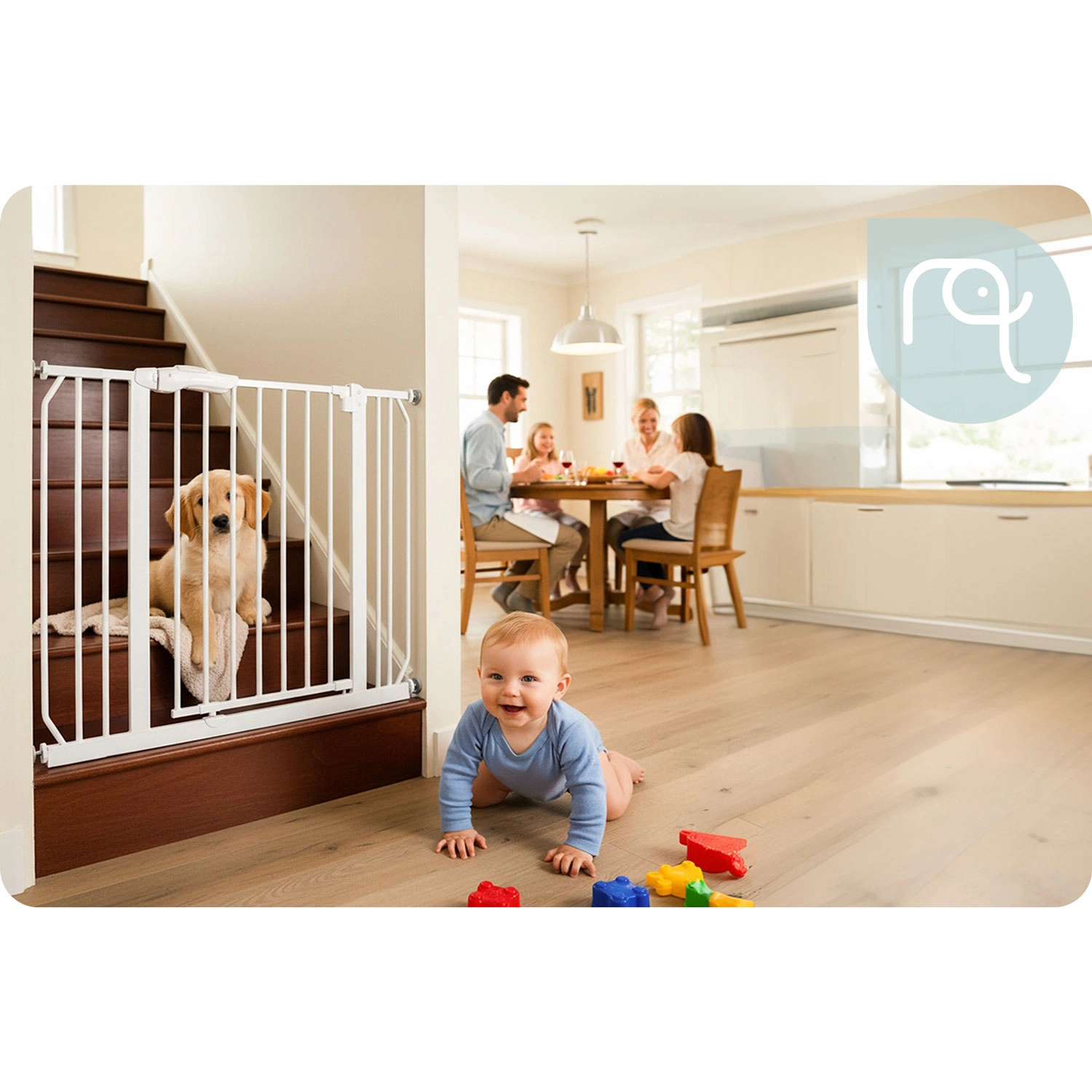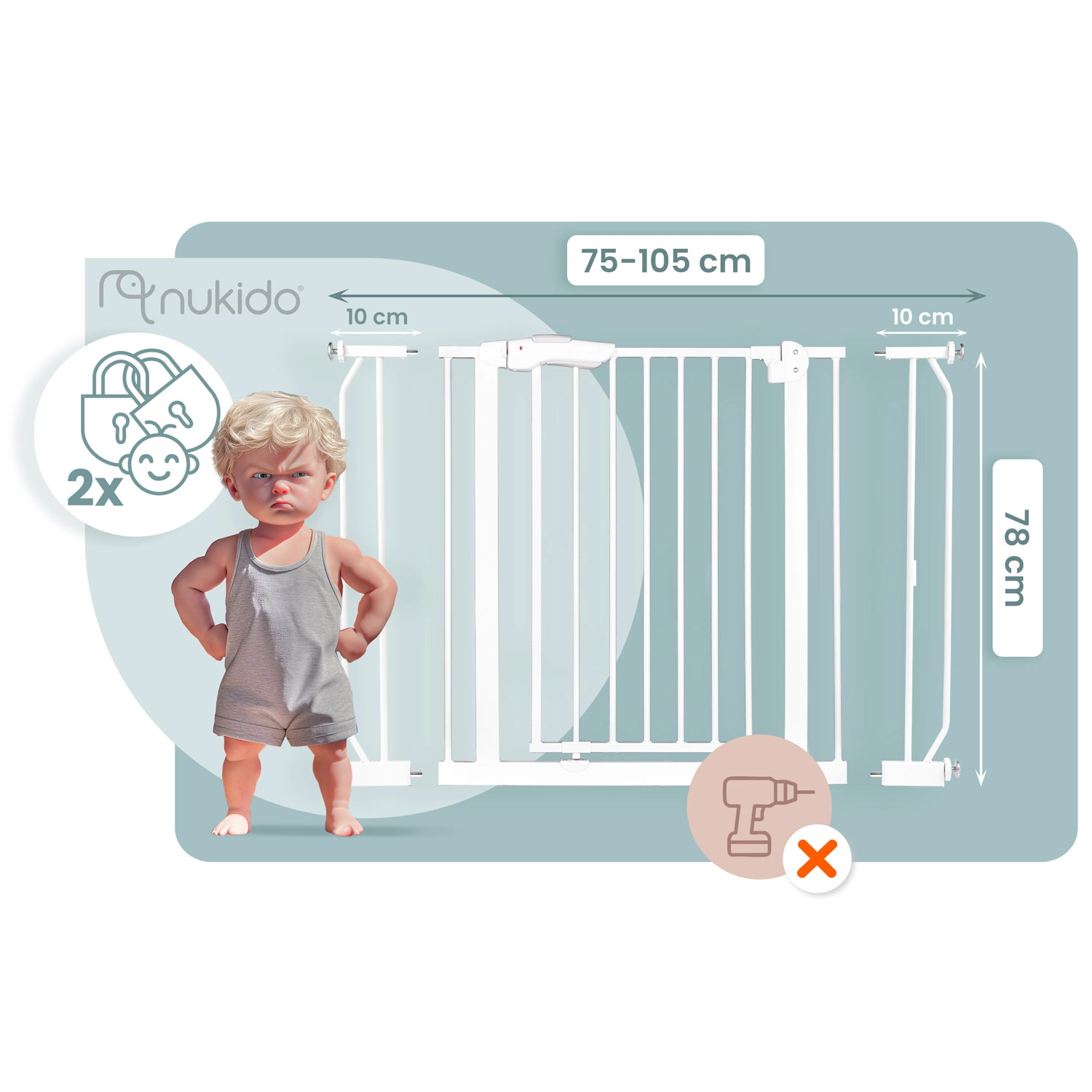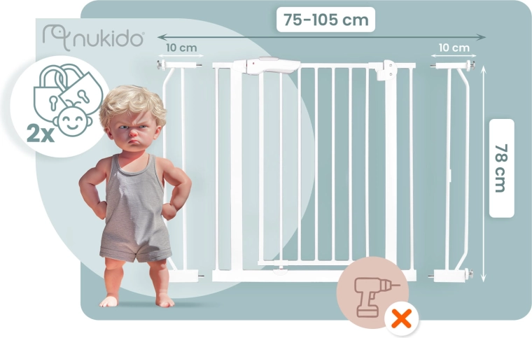 Bezpečnostní zábrana NUKIDO v elegantní bílé barvě se přizpůsobí většině interiérů a díky rozpěrnému uchycení ji nainstalujete během pár minut – bez poškození zdi či zárubně. Robustní kovové provedení a certifikace EN 1930:2011 zajišťují spolehlivou ochranu dětí i menších domácích mazlíčků.