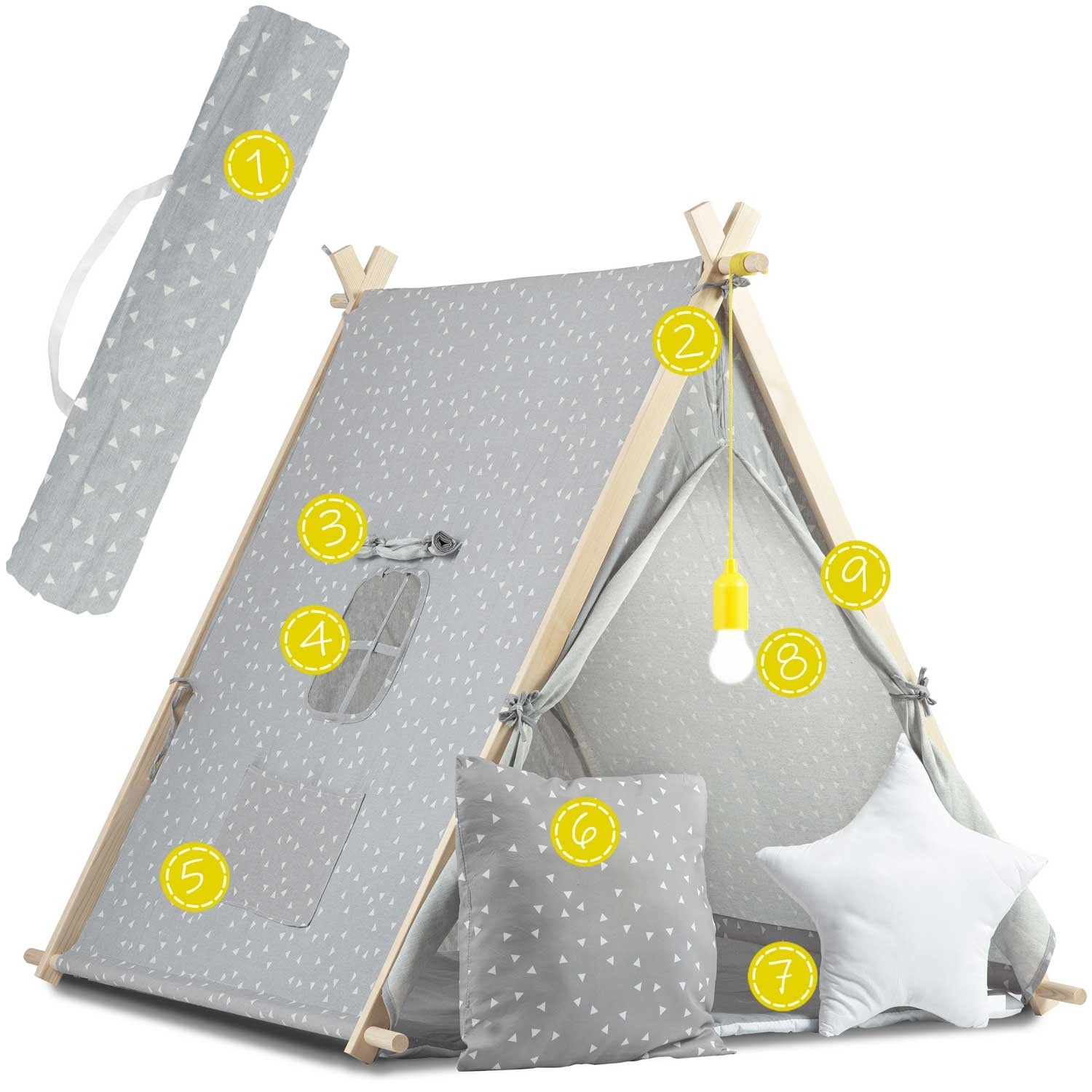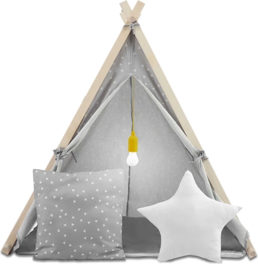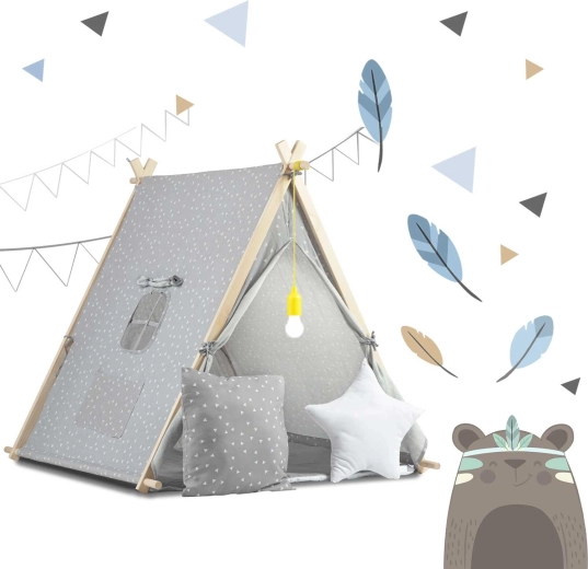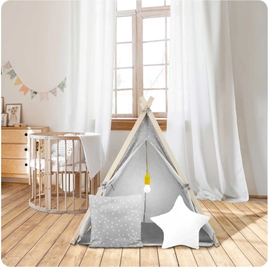 Stylové dětské teepee Nukido v šedé barvě je navržené pro pohodlné hraní, odpočinek i čtení. Prémiová bavlněná textilie skvěle dýchá, zatímco lehký, ale pevný rám z přírodního dřeva zajišťuje stabilitu na různých površích. Součástí je silná izolační podložka s protiskluzovou úpravou a dva měkké polštářky pro maximální komfort.