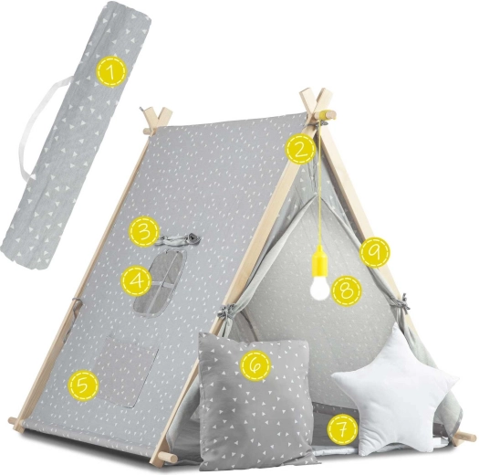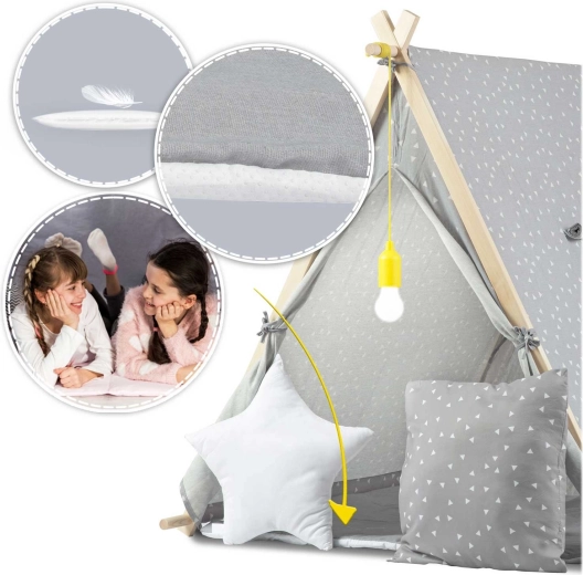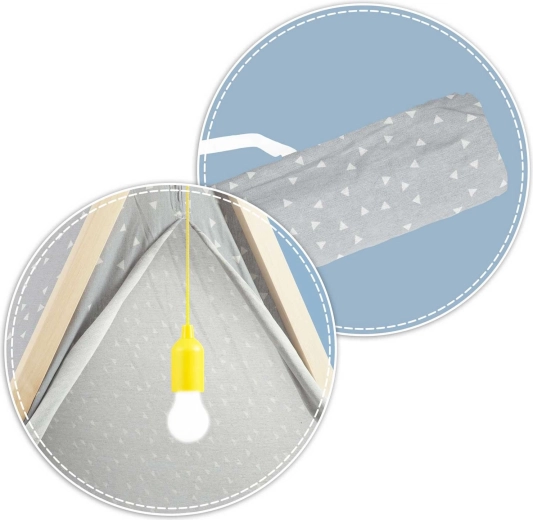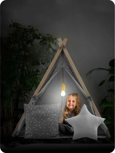 Promyšlené detaily jako okénko s roletkou, odsunovací vstupní chlopně a kapsa na drobnosti podporují dětskou fantazii i pořádek. LED lampičku lze zavěsit kamkoli uvnitř, takže si děti vytvoří kouzelnou atmosféru pro vlastní „táborovou“ základnu. Po složení teepee snadno přenesete v přiloženém obalu – domů, do herny i na zahradu (ve stínu).