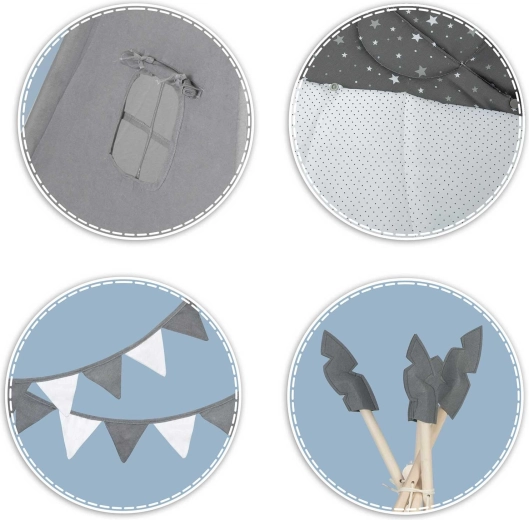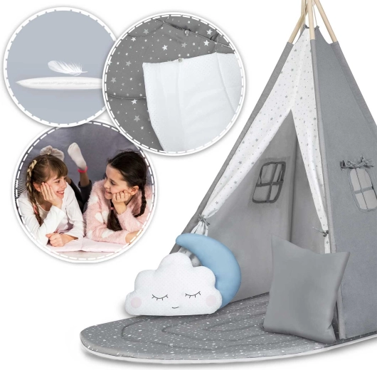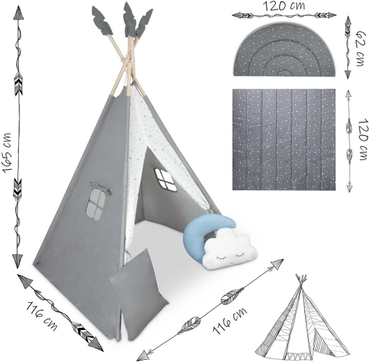 Součástí je extra silná dvoudílná podložka s protiskluzovými výstupky pro bezpečí a teplo od podlahy – lze ji používat i samostatně jako kobereček. V balení najdete také 3 polštáře (čtverec, měsíc, obláček), girlandu, filcová pírka a stabilizátor pro maximální stabilitu konstrukce ze 4 smrkových/borovicových tyčí. Dvě okénka s roletkami a uchycení dveří na šňůrky otevírají prostor fantazii i větrání.