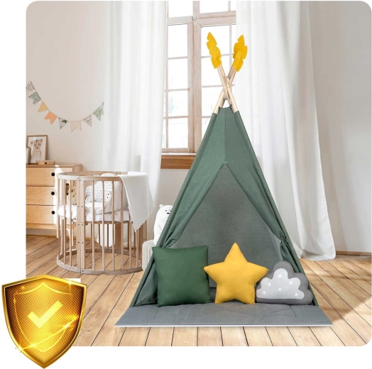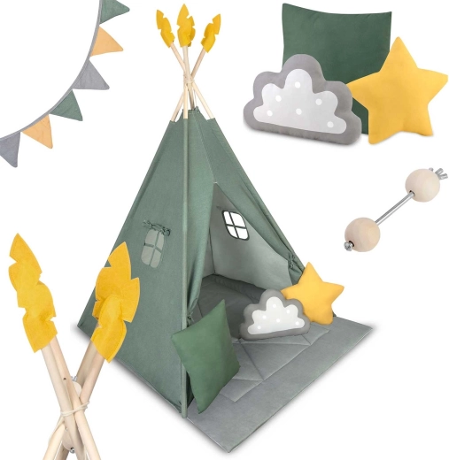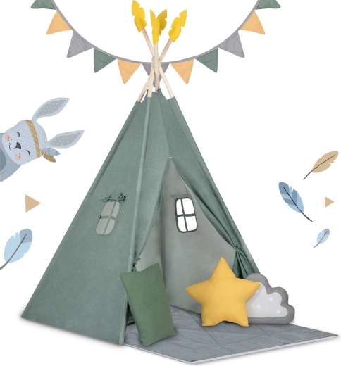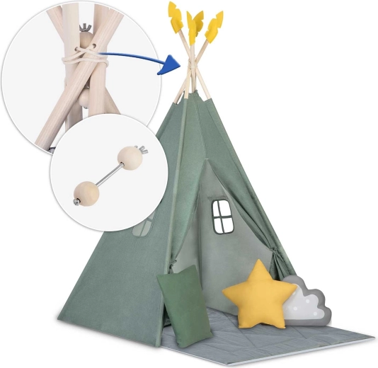 Dětské teepee stan Nukido zelený s podložkou a polštáři