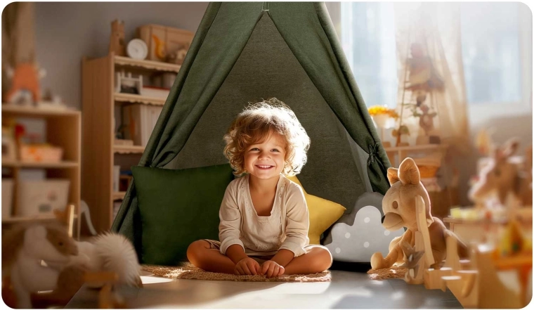 Vytvořte dítěti jeho vlastní útočiště – stylové dětské teepee Nukido v zelené barvě. Stan z kvalitních přírodních materiálů nabízí měkký a odolný textil, stabilní konstrukci se stabilizátorem, snadné skládání a bohatou výbavu. V balení najdete 3 polštáře, silnou izolační podložku s protiskluzem, okénka s roletkami a dekorace. Ideální pro hraní, čtení i relax v duchu metody Montessori.