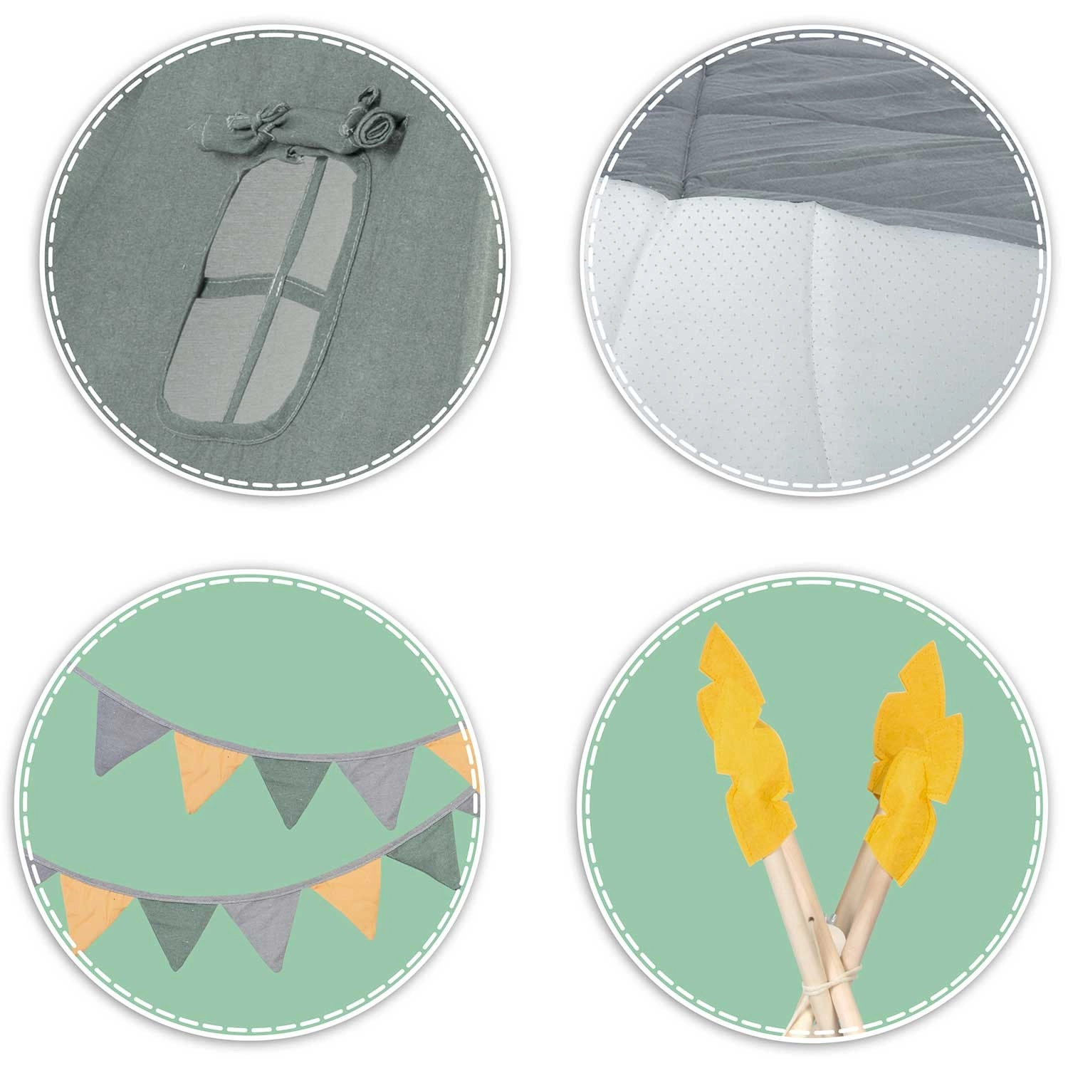 Součástí sady je tlustá izolační podložka s protiskluzovými výstupky pro pohodlí a bezpečí, a také tři polštáře (čtverec, hvězda a obláček), které vytvářejí příjemnou zónu pro hraní i odpočinek. Praktické okénko s roletkou a zavazovacími pásky přináší více zábavy a světla, zatímco stabilizátor zdarma zajišťuje pevné postavení stanu.