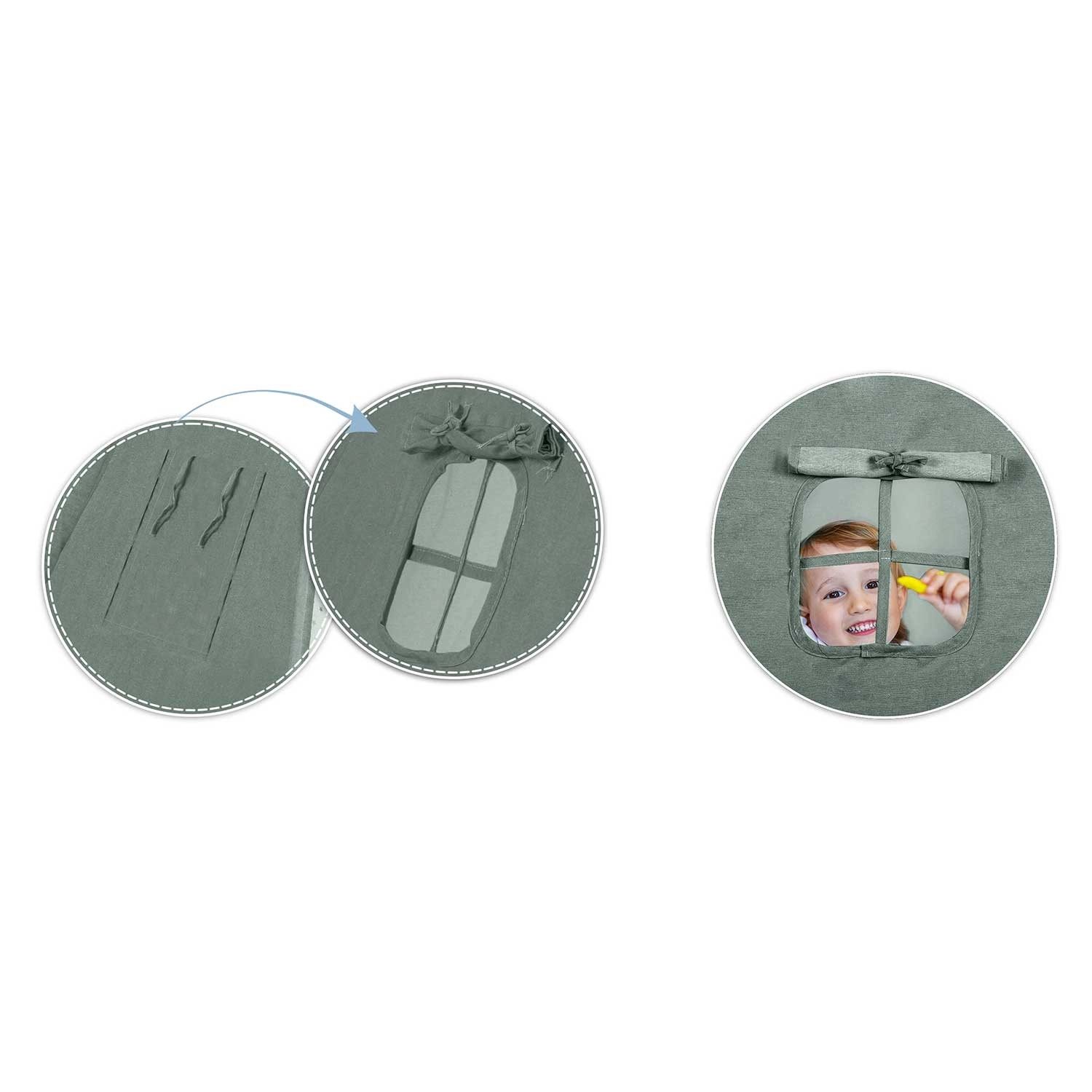 Okénko s roletkou a zavazovacími pásky umožní větrat, hrát si na schovávanou i koukat ven. Dveřní závěsy snadno svážete pro pohodlný vstup.