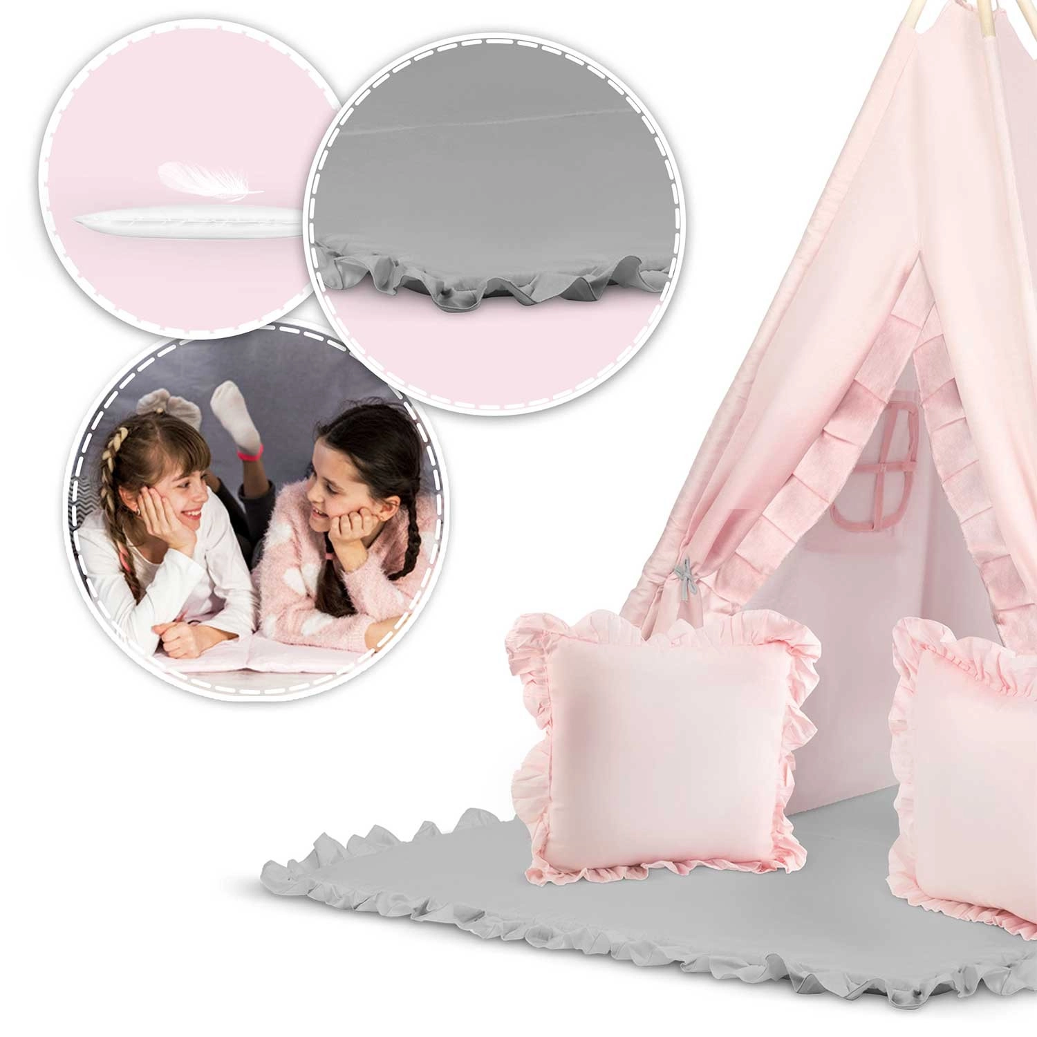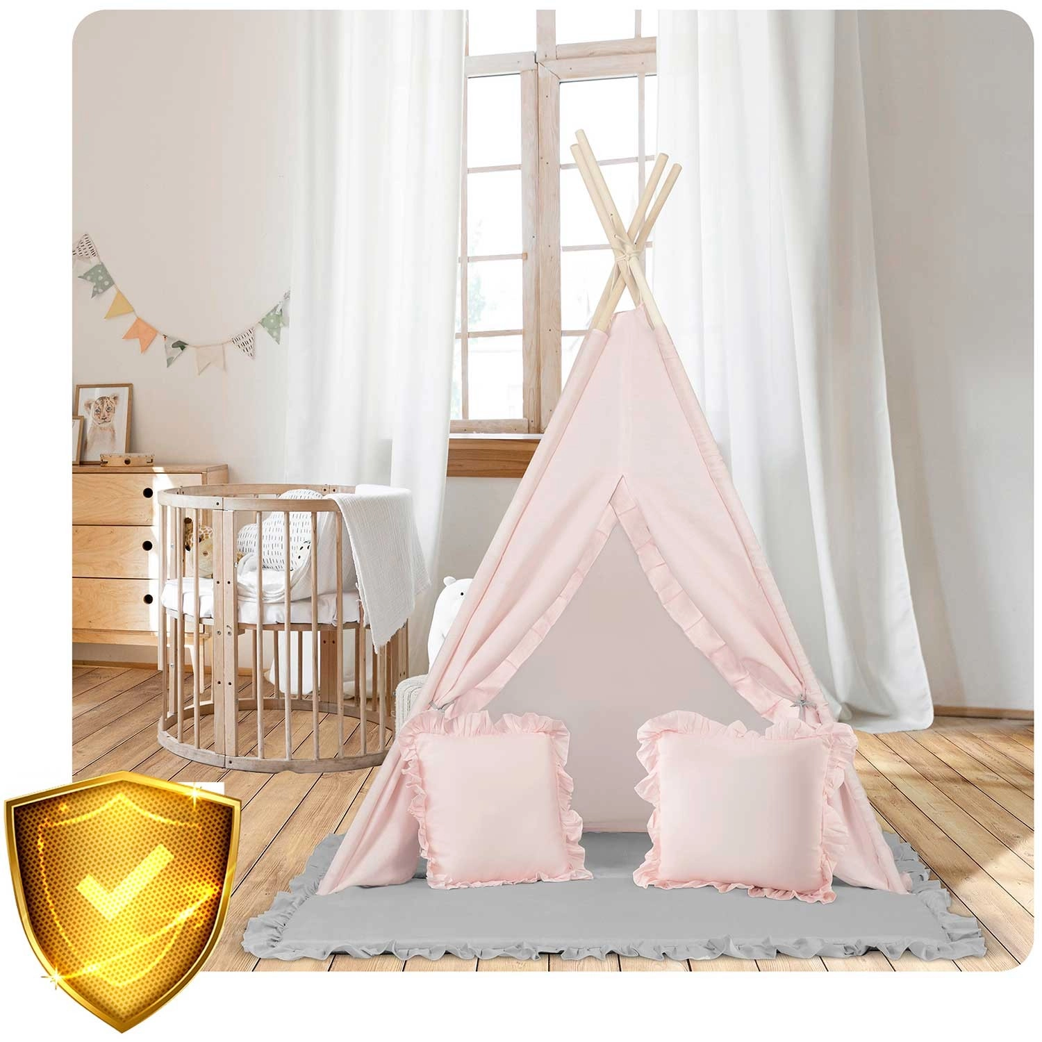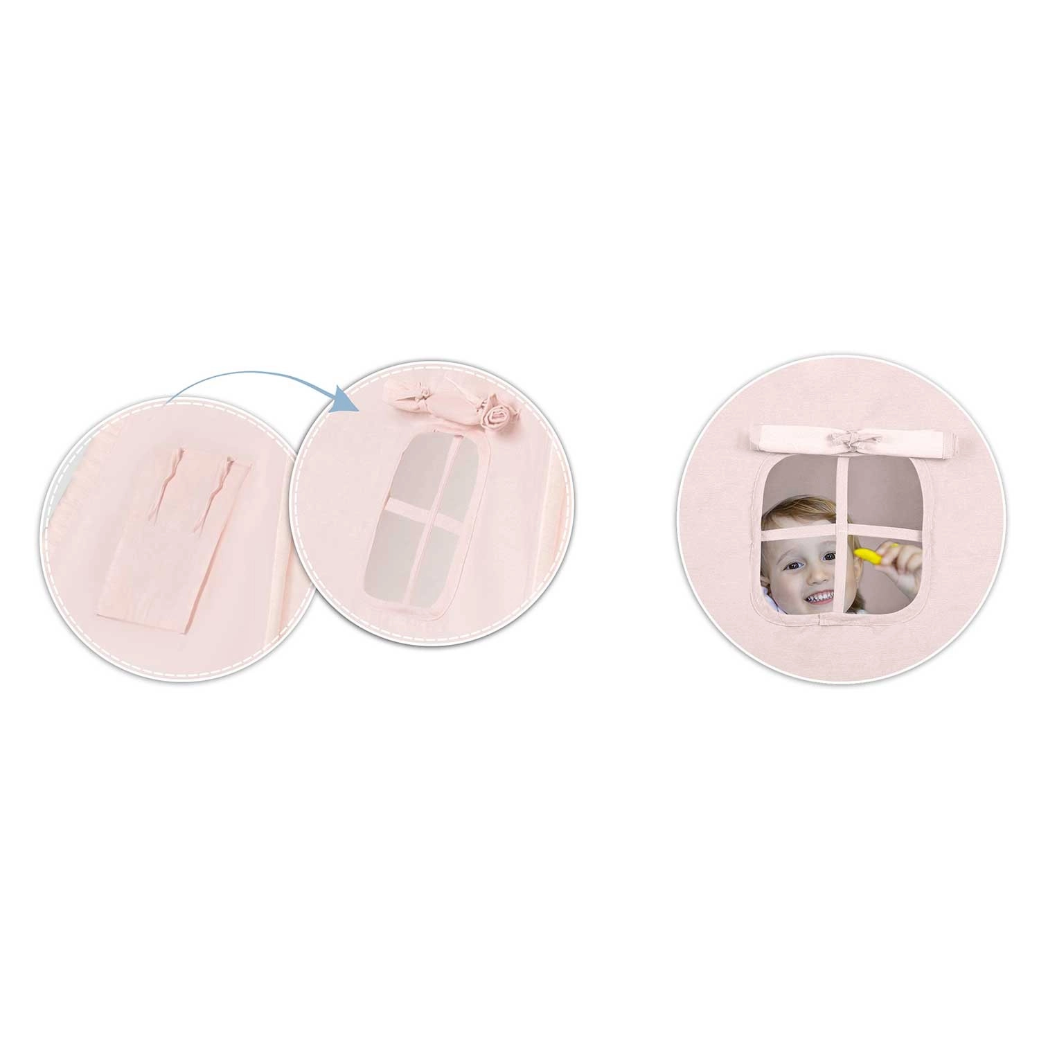 Součástí je extra tlustá izolační podložka s protiskluzovými výstupky pro měkké a teplé posezení, a také dvě polštářky (čtverec a srdce) pro ještě větší pohodlí. Otevíratelné okénko s roletkou podporuje fantazii i kontakt s rodiči, zatímco girlanda a ozdobné detaily dodají prostoru útulnou atmosféru.