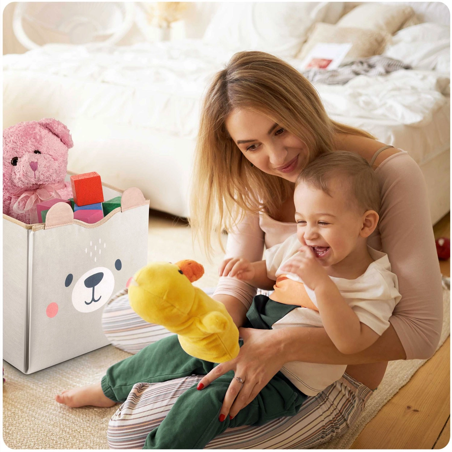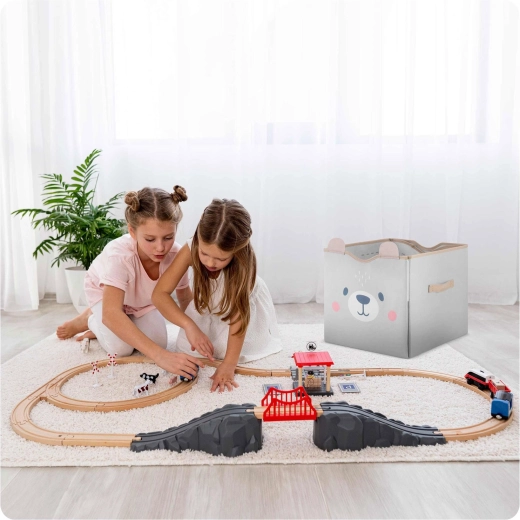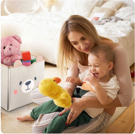 Objevte chytré řešení úklidu a hraní v jednom. Koš na hračky a hrací podložka 2v1 je navržen tak, aby šetřil prostor, čas i nervy. Jako koš nabízí mimořádně velký objem a stabilitu, po rozložení se promění v měkkou podložku s cestami pro autíčka a figurky. Minimalistický šedý design s medvídkem krásně zapadne do moderního interiéru a působí jako dekorativní prvek.