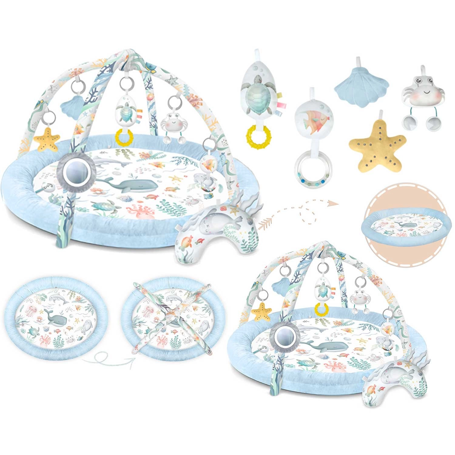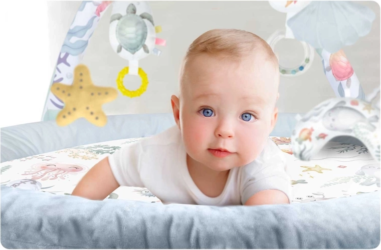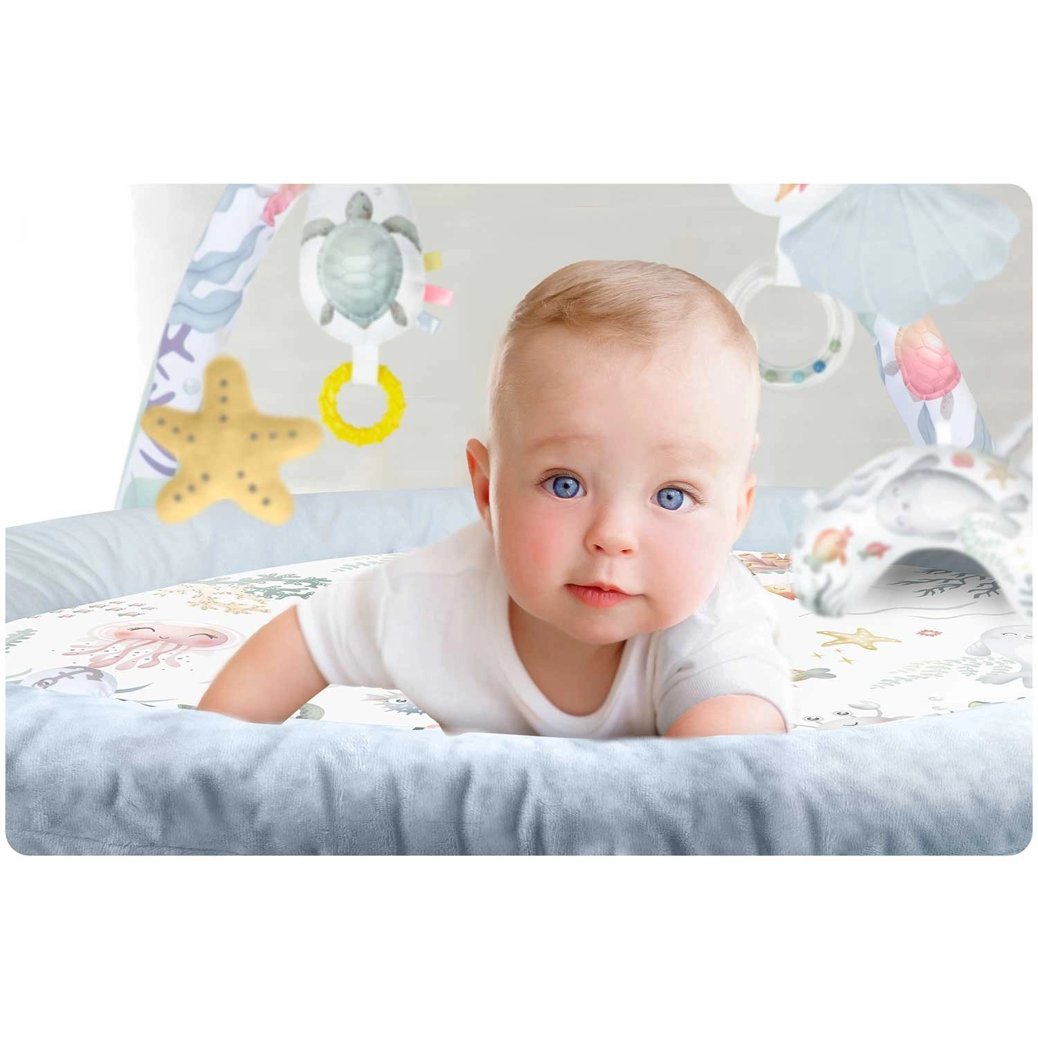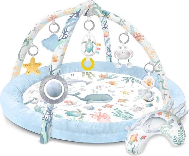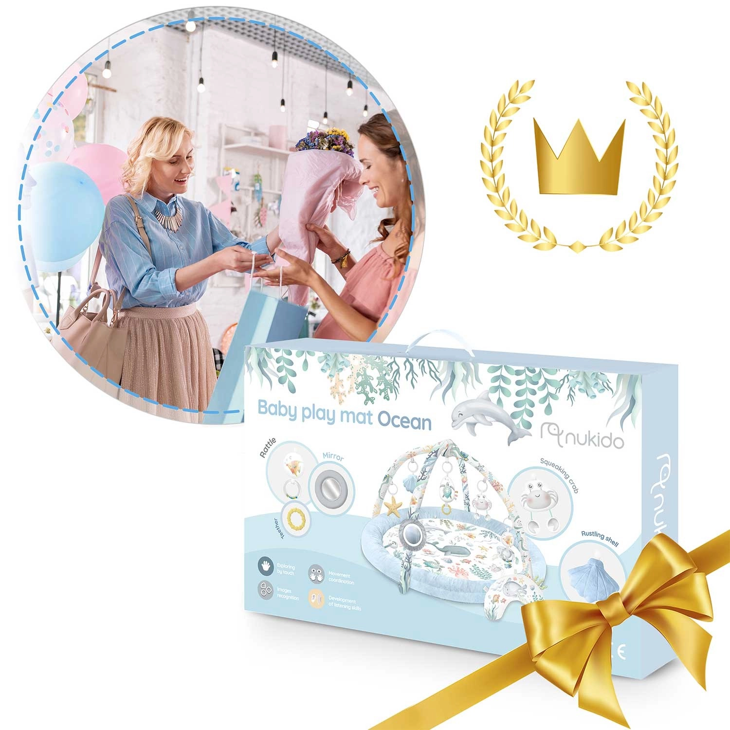 Hrací podložka Nukido Ocean vytváří útulné a bezpečné prostředí pro novorozence i větší miminka. Dva křížené oblouky nesou odnímatelné hračky, které rozvíjejí zrak, hmat i sluch – od zrcátka pro sebepoznání přes chrastítka až po šustící prvky a pískacího kraba. Součástí je i měkký polštářek pro pohodlné hraní na bříšku.
