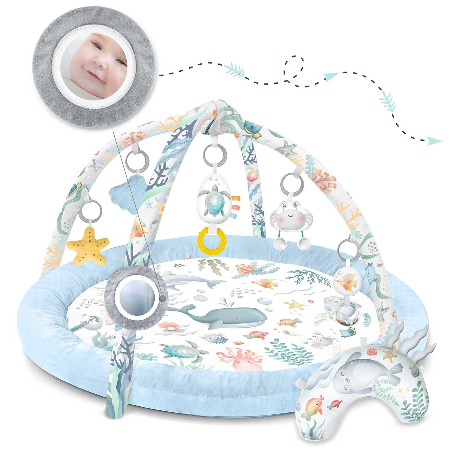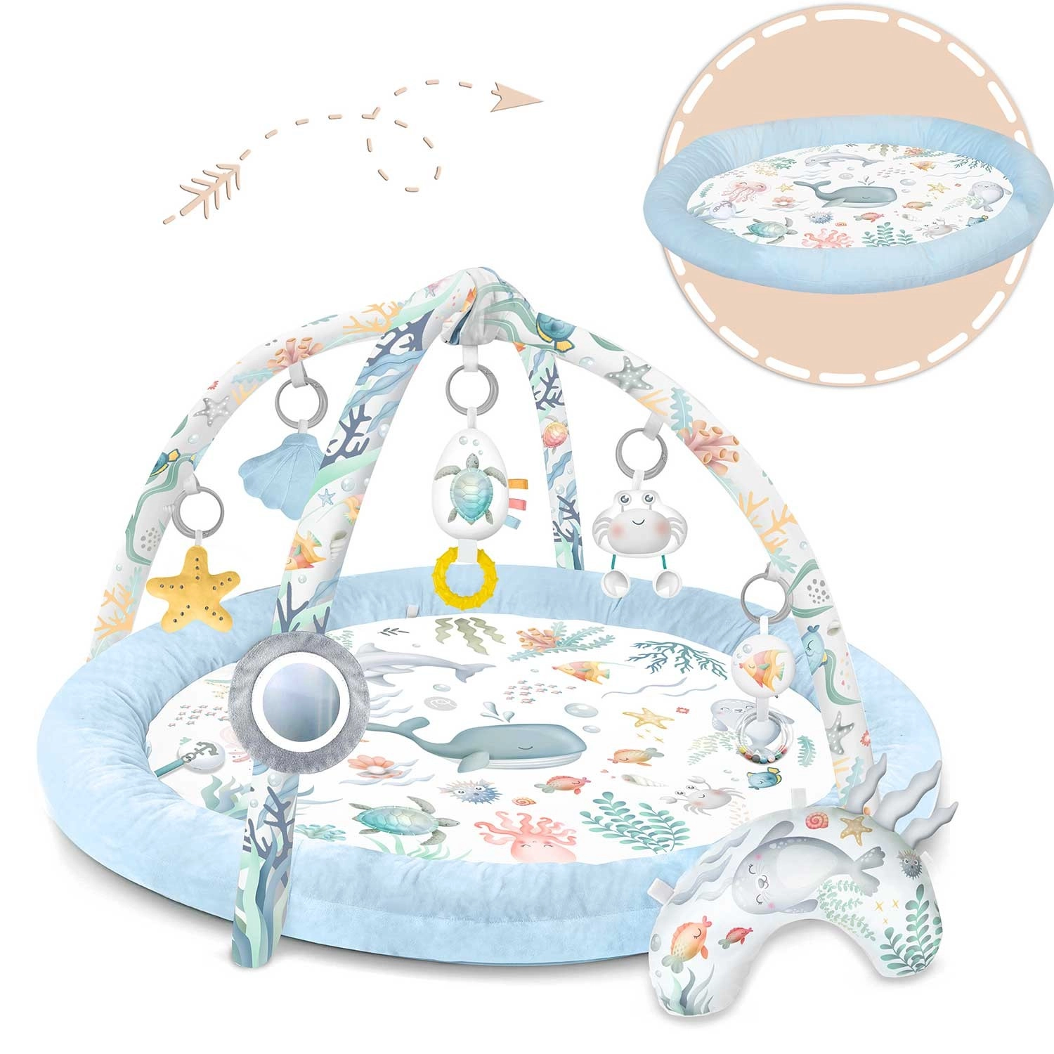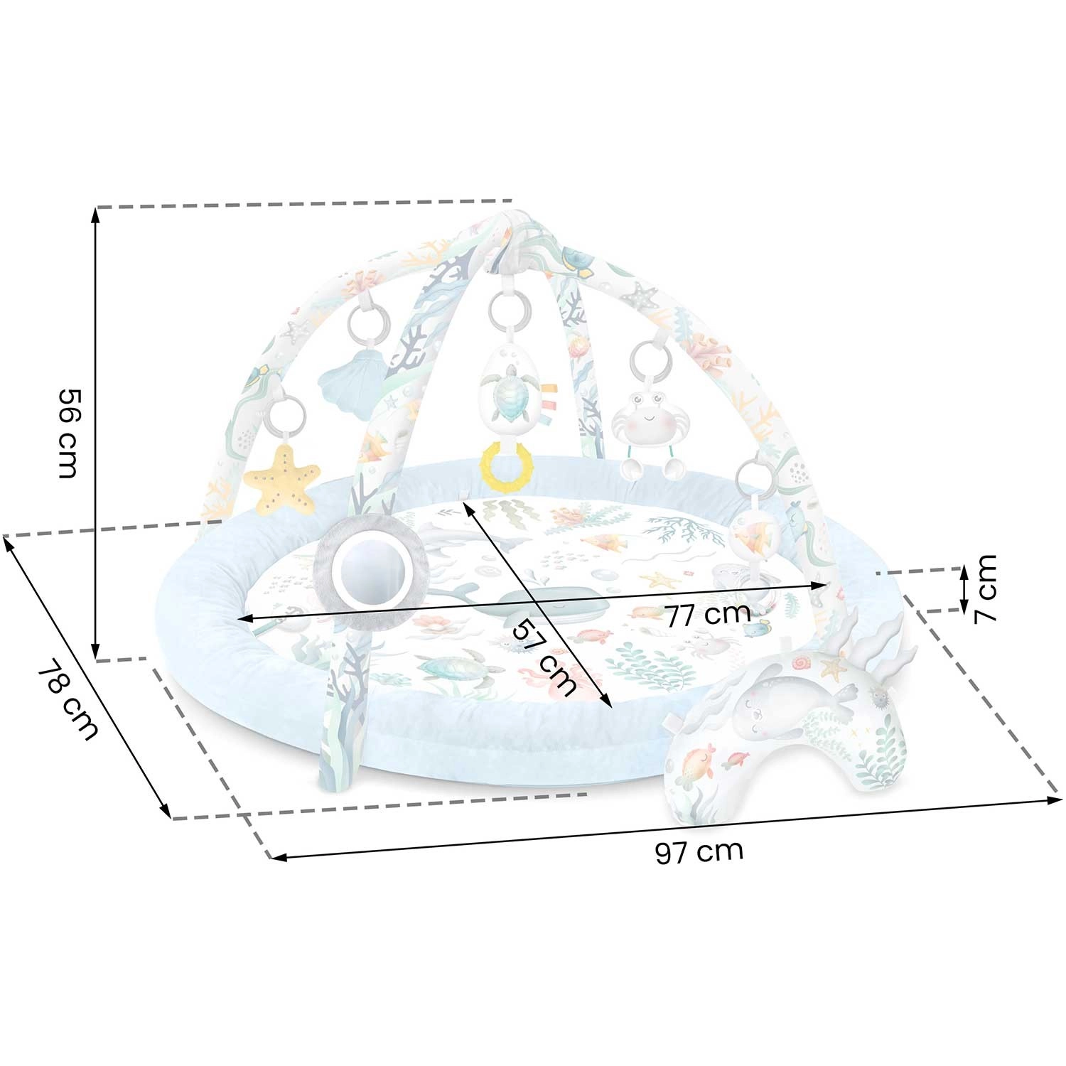 Hrací podložka Nukido Ocean vytváří útulné a bezpečné prostředí pro novorozence i větší miminka. Dva křížené oblouky nesou odnímatelné hračky, které rozvíjejí zrak, hmat i sluch – od zrcátka pro sebepoznání přes chrastítka až po šustící prvky a pískacího kraba. Součástí je i měkký polštářek pro pohodlné hraní na bříšku.