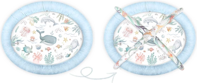 Oblouky lze rychle odepnout a deku složit. Získáte útulný kokon pro novorozence i prostornou podložku pro batole – vždy s měkkým, snadno čistitelným povrchem.