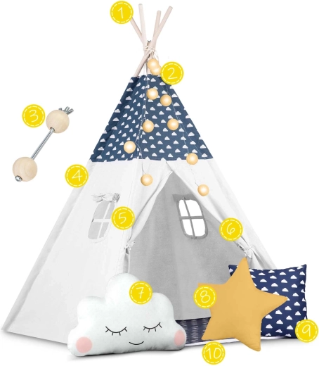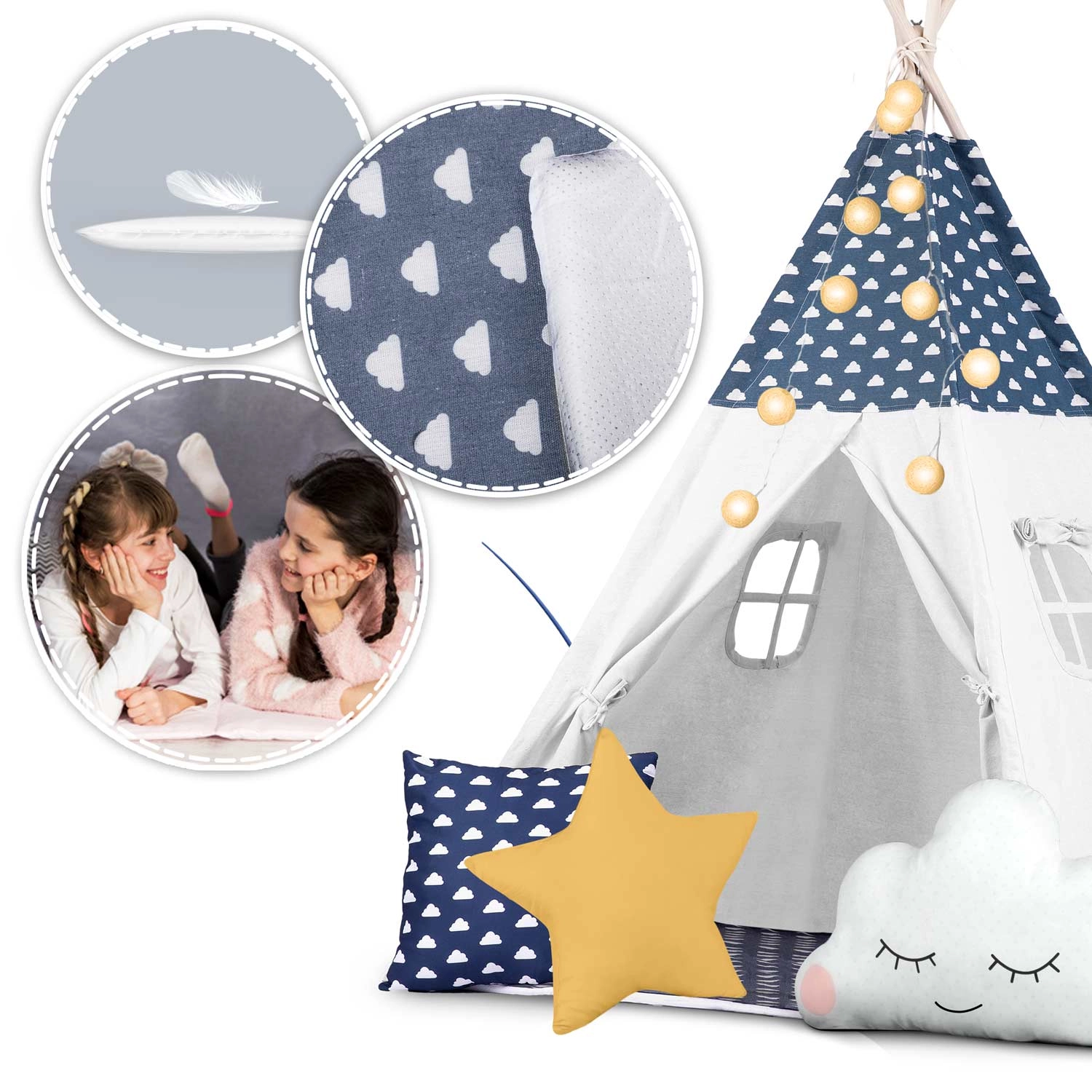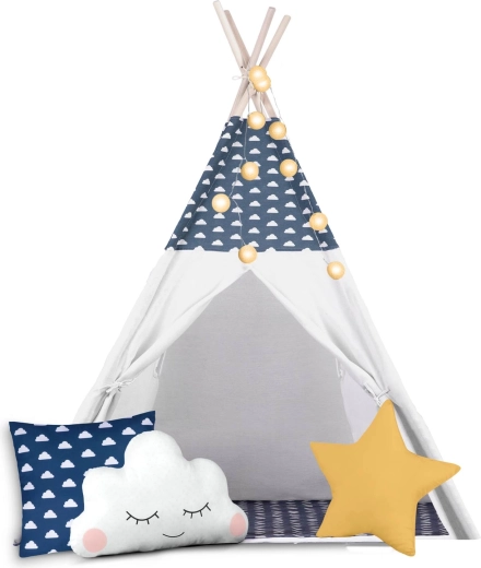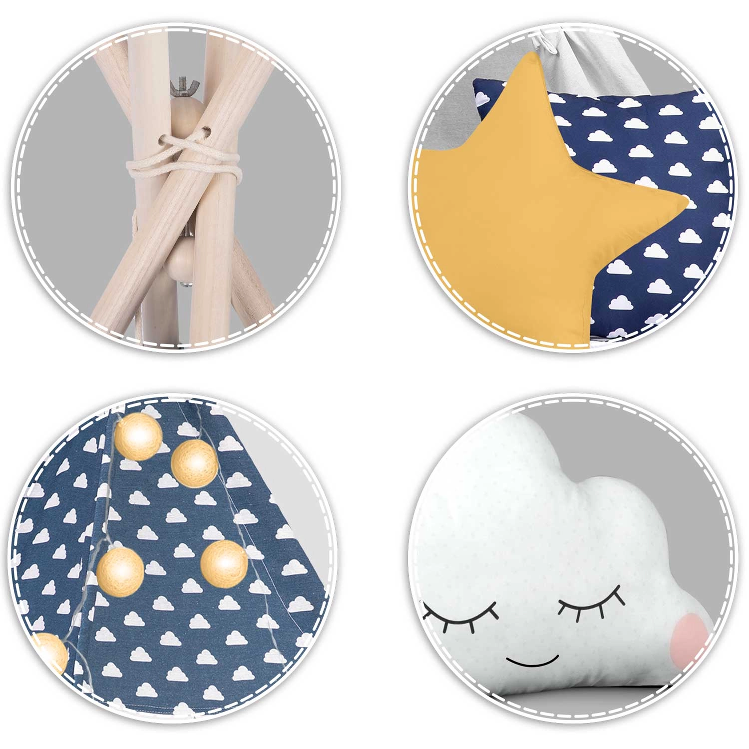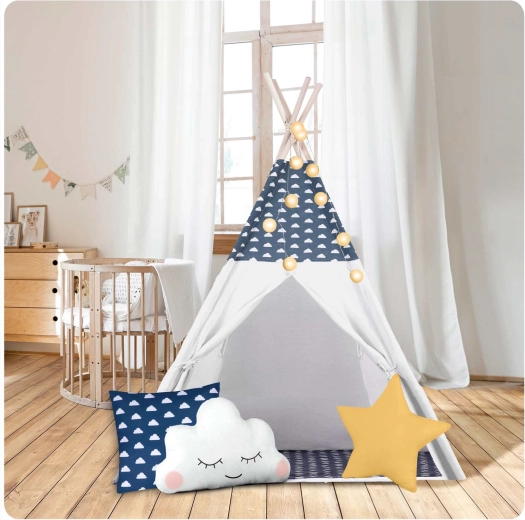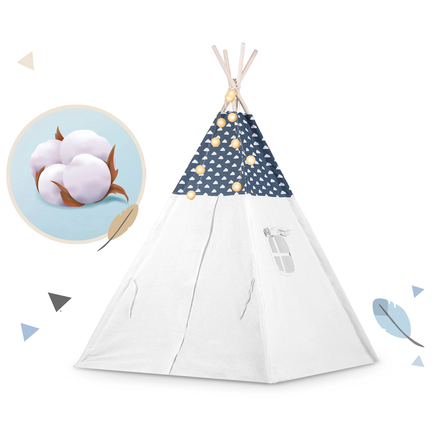 Teepee je ušité z prémiové 100% bavlny s vyšší gramáží pro měkkost, výdrž a skvělou prodyšnost. Dřevěné borovicové tyče zajišťují pevnou a stabilní konstrukci.