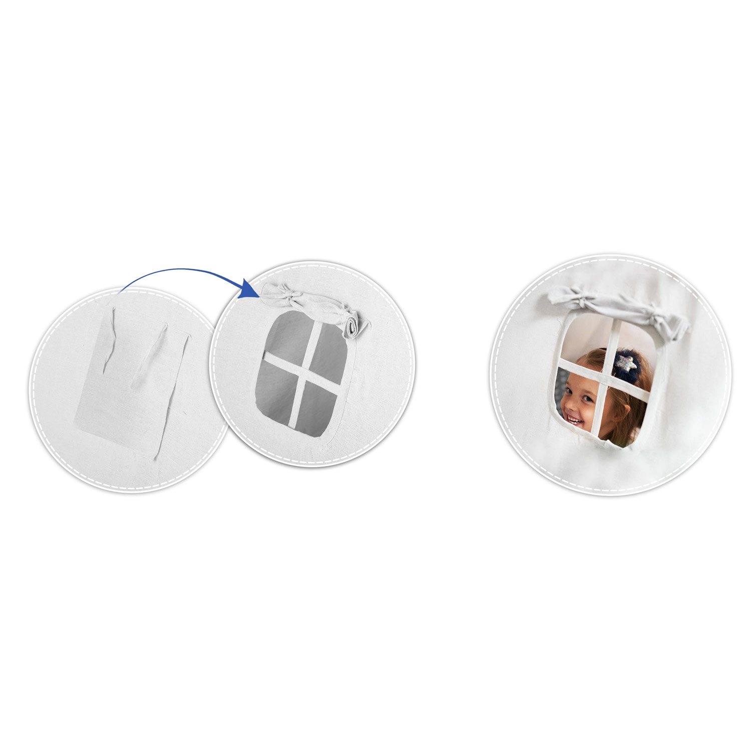 Součástí setu je silná, měkká podložka s protiskluzovou úpravou, kterou lze použít i samostatně jako kobereček. Tři polštáře v hravých tvarech (mráček, hvězda a vzor) zvyšují komfort i dekorativnost dětského pokoje. Praktické detaily jako odsunovací přední clony a okénko s roletkou podporují zábavu a zároveň větrání.
