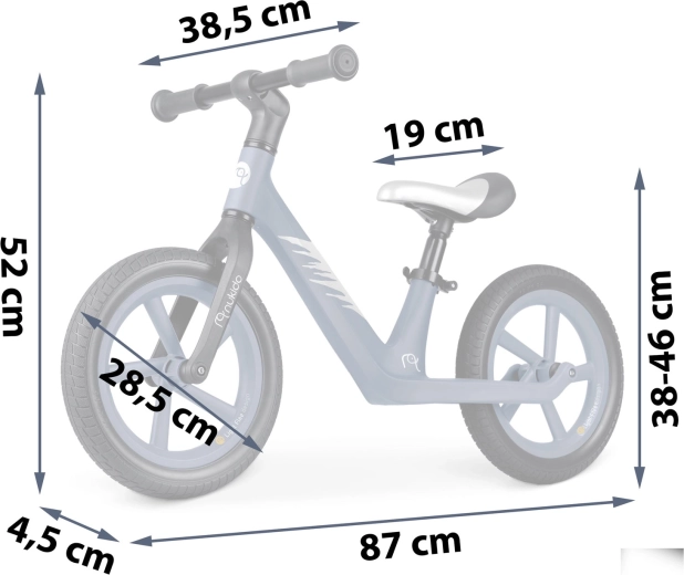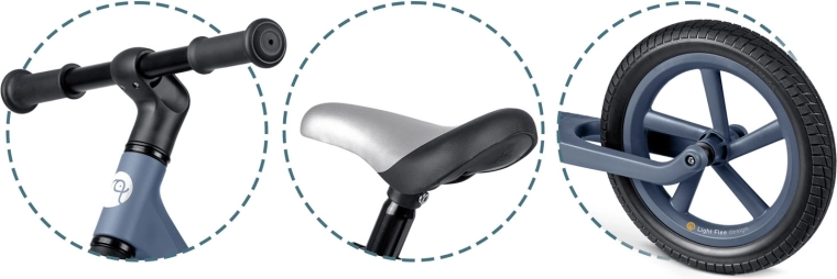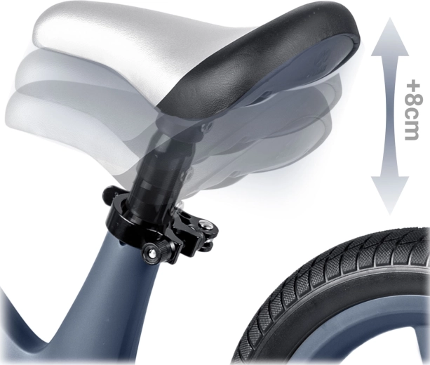 Díky plynule nastavitelné výšce sedla (cca 35–41 cm) odrážedlo roste spolu s dítětem a zajišťuje ideální posed v každé fázi vývoje. Neprorazitelná EVA kola 12" tlumí nerovnosti a nevyžadují údržbu, gumové rukojeti se stopery chrání dětské ruce a přinášejí jistotu při řízení.