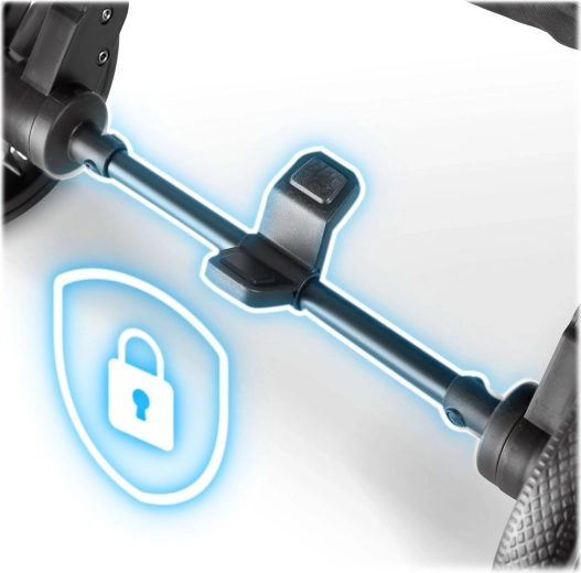 Přední kola s otočením 360° a odpružením pro snadné manévrování v těsných prostorech, velká zadní kola pro stabilitu v terénu a spolehlivá brzda. Pětibodový pás s měkkými polstry drží dítě v bezpečí.