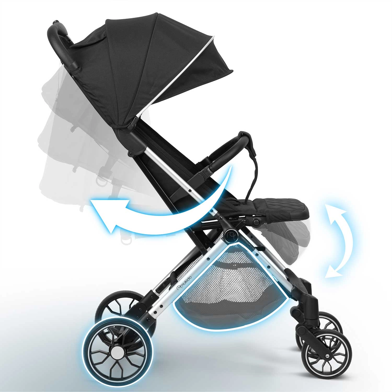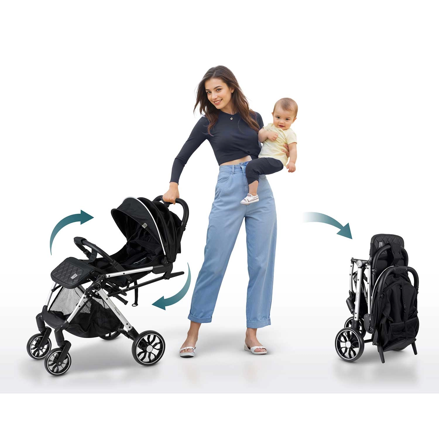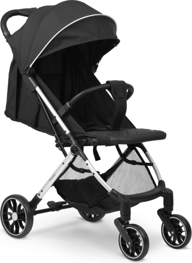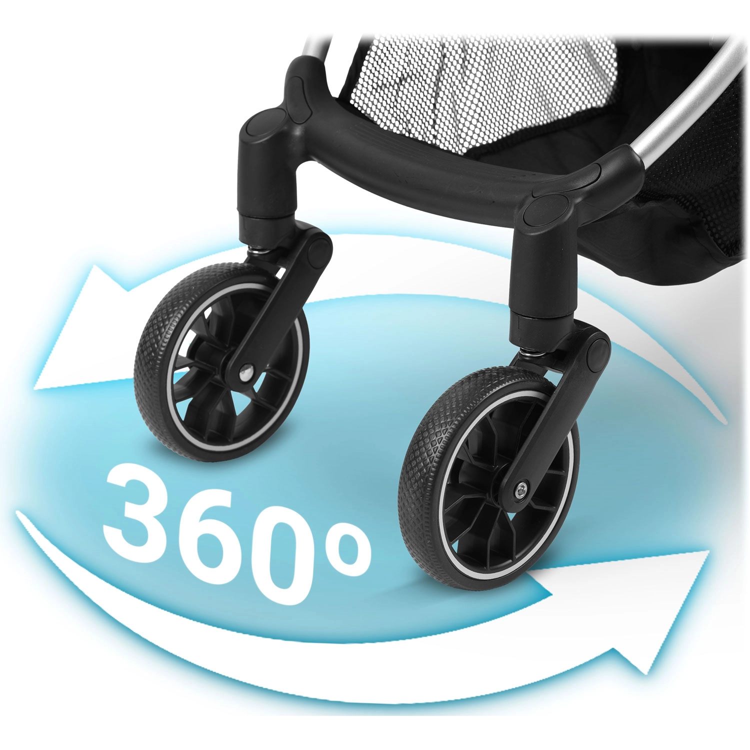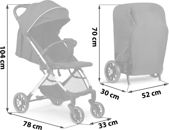 Intuitivní tlačítko umožní složit kočárek jednou rukou během okamžiku. Kompaktní rozměry po složení se hodí do kufru auta i jako příruční zavazadlo do letadla. Praktický transportní kryt a madlo pro tažení usnadní přesun.