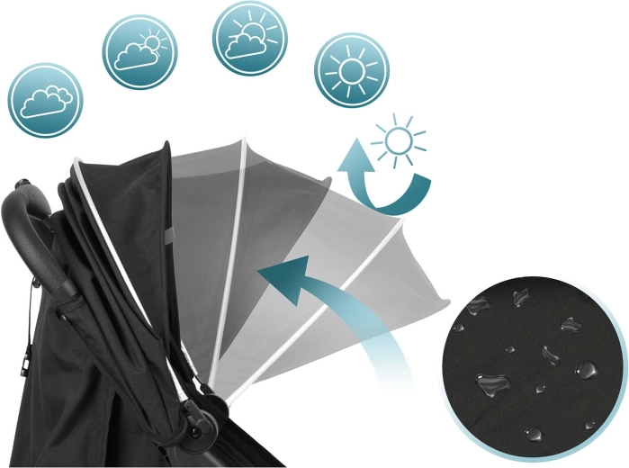 Rozšiřitelná, voděodolná stříška chrání před sluncem, větrem i lehkým deštěm. Lze ji nastavit podle toho, zda dítě spí, nebo sleduje okolí. V balení najdete i pláštěnku a teplý nánožník.