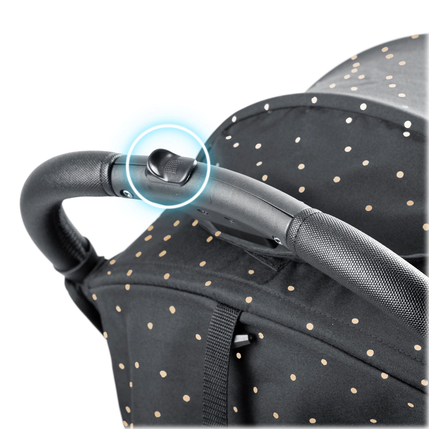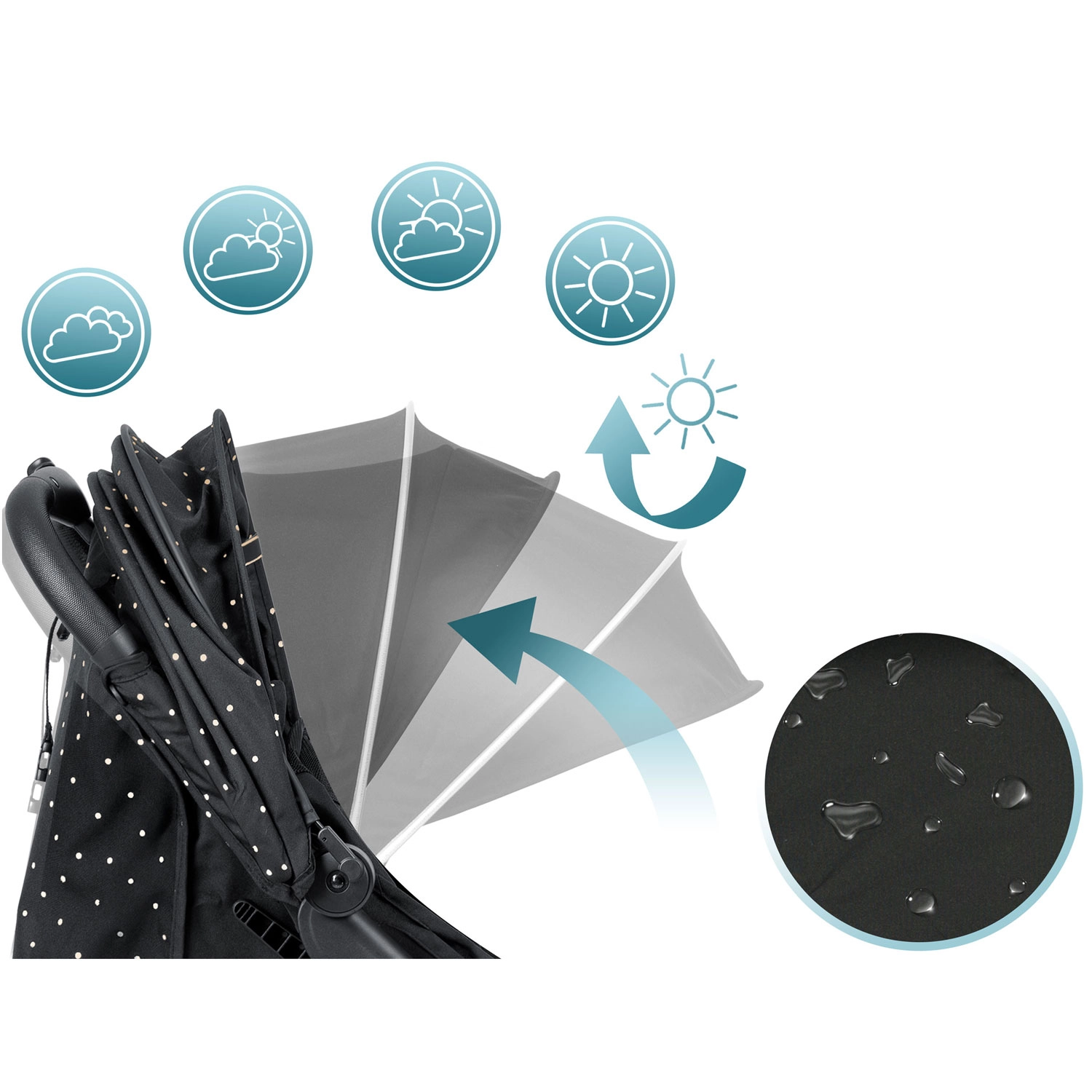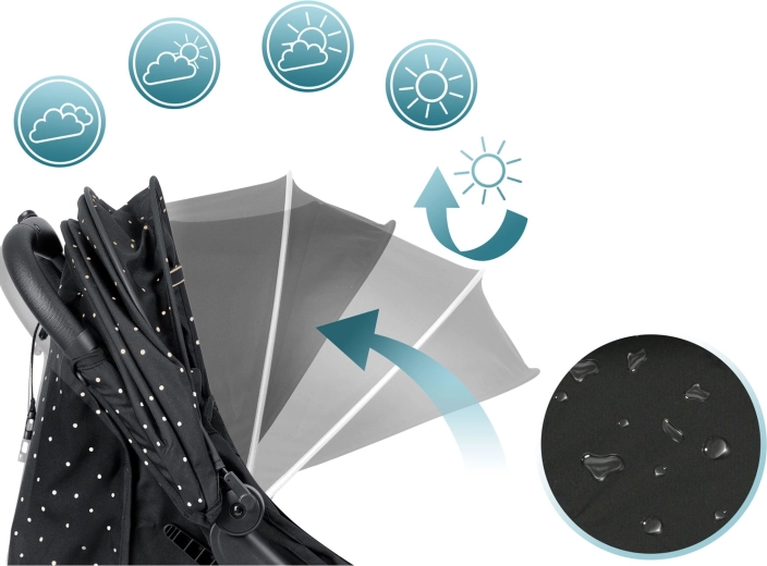Stříška s více polohami chrání dítě před sluncem, větrem i lehkým deštěm. Vodoodpudivá úprava materiálu usnadňuje údržbu a zajišťuje komfort v každé roční době.