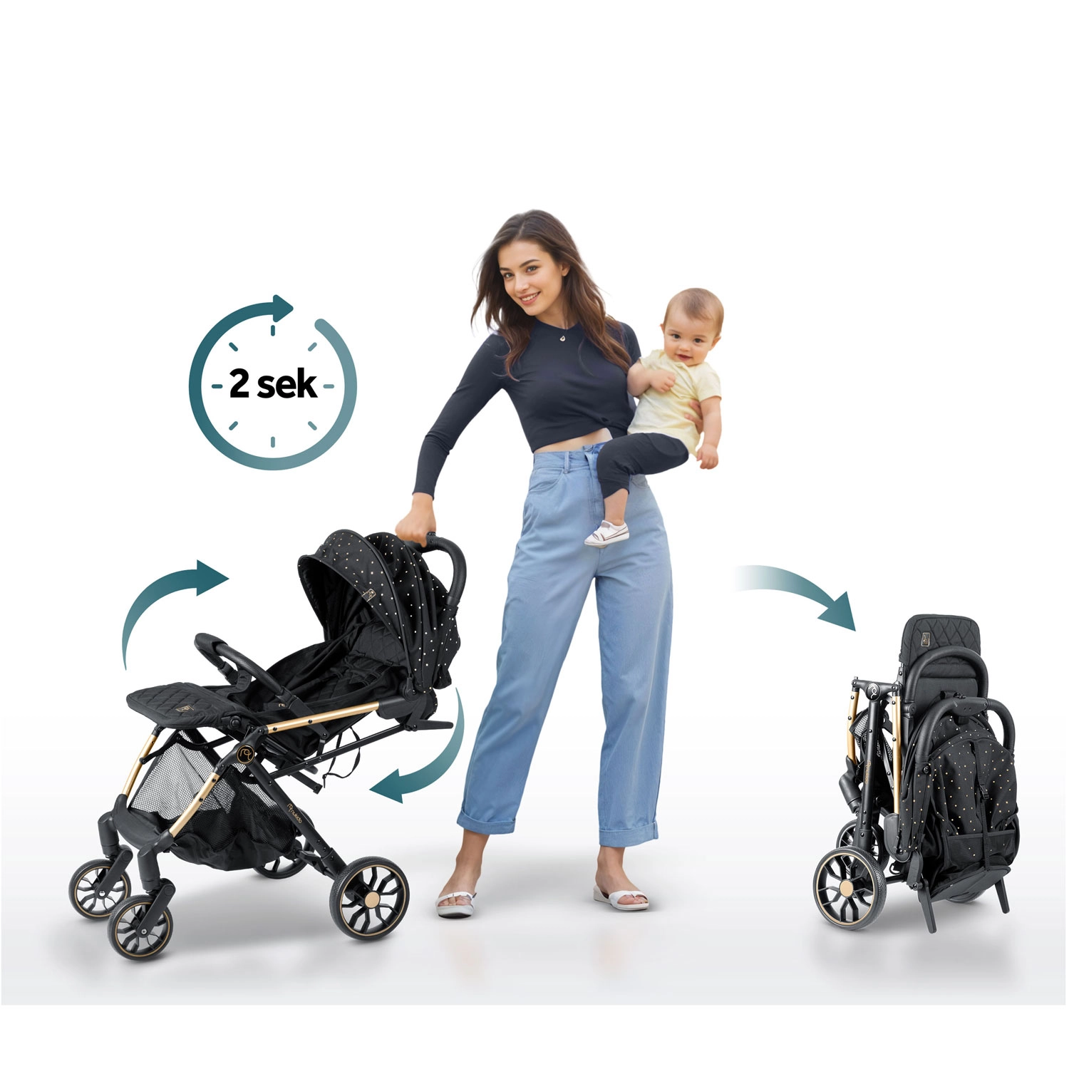 • Bezpečnost na prvním místě: pětibodové pásy, zadní brzda, stabilní rám.