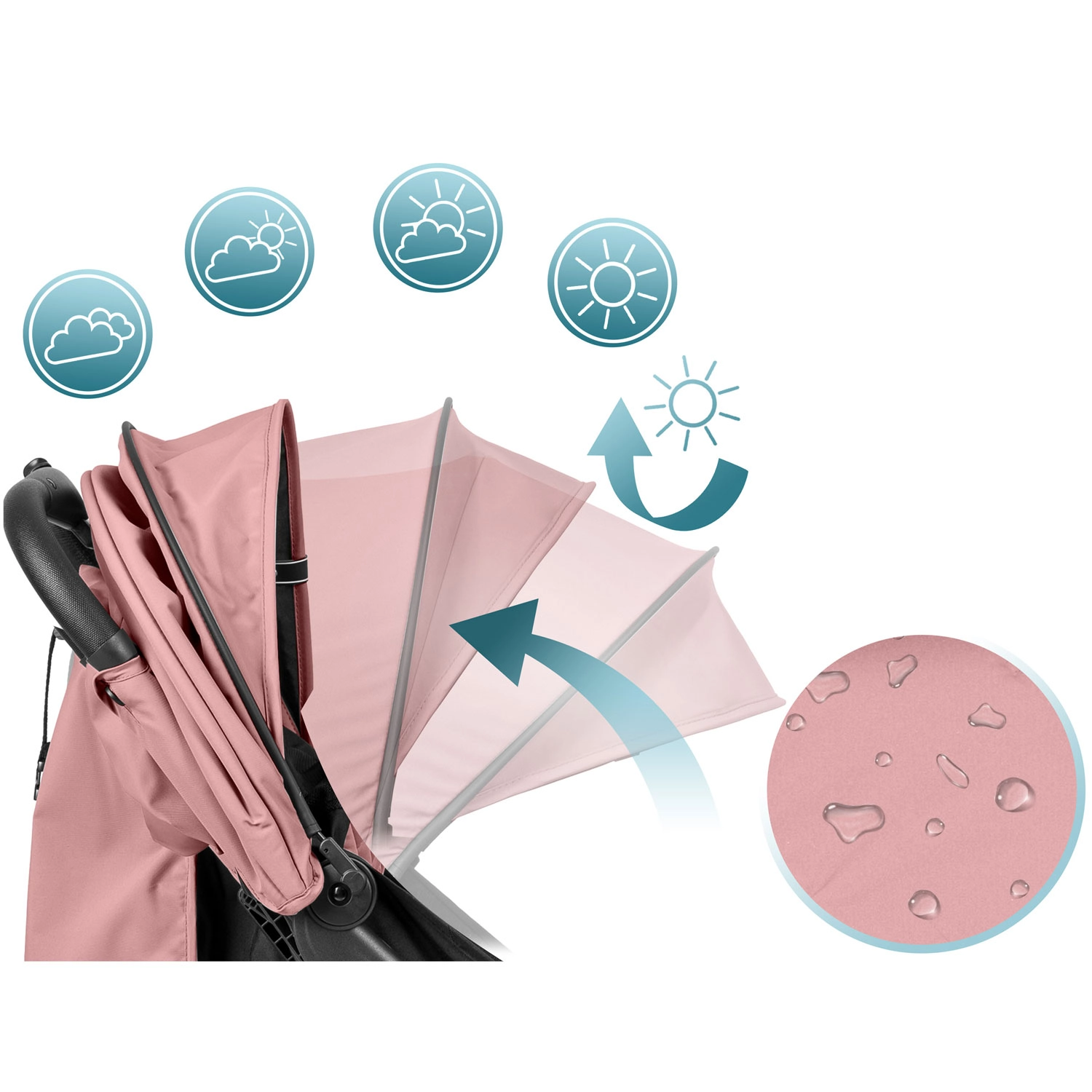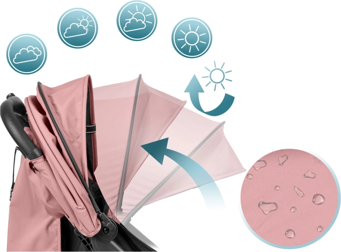 Rozšiřitelná stříška s UV ochranou a vodoodpudivou úpravou kryje před sluncem, větrem i lehkým deštěm. Pláštěnka je součástí balení.