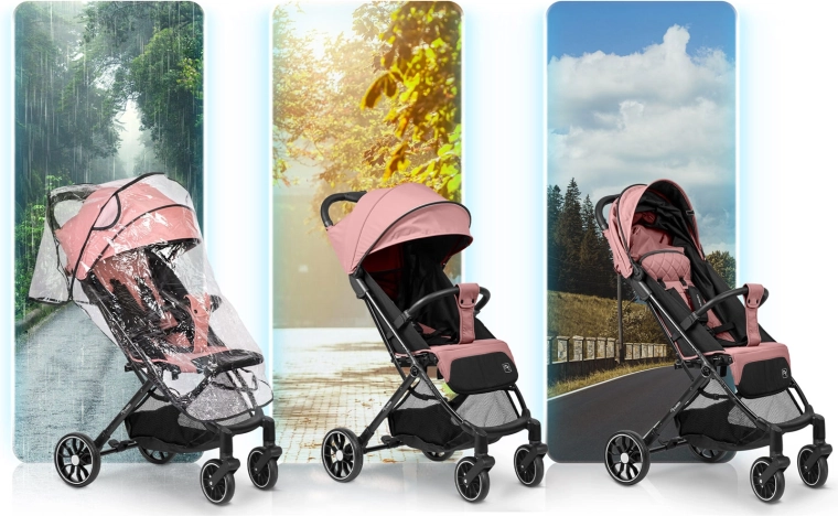 - Na každé počasí: stříška se dá přizpůsobit slunci i dešti, pláštěnka je součástí balení.