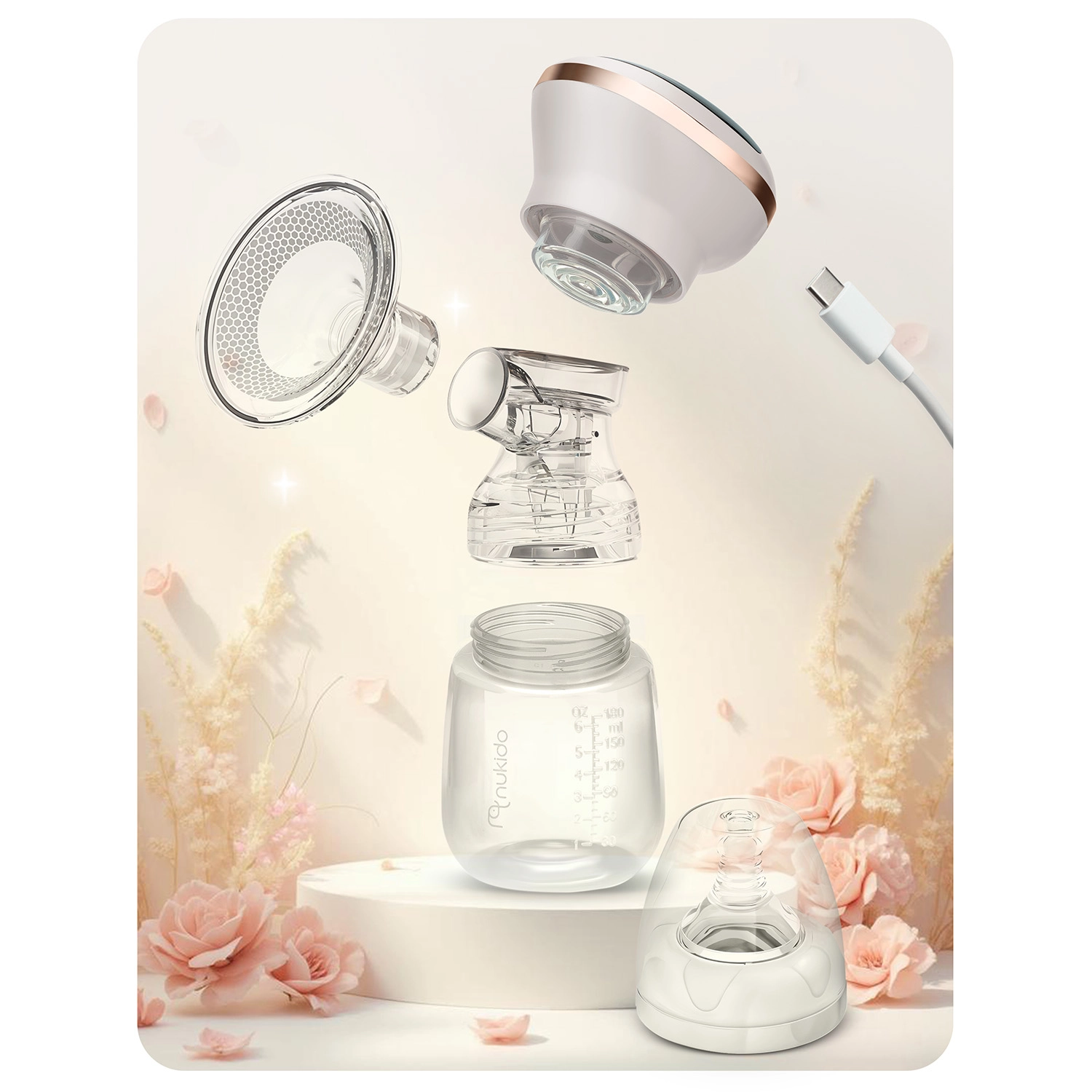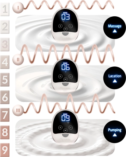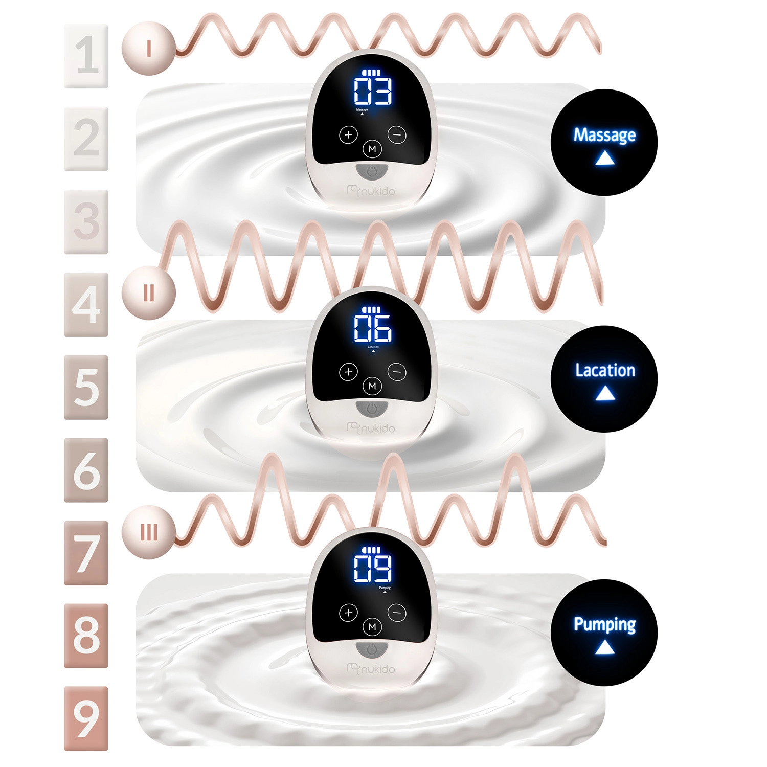 Odsávačka Nukido věrně napodobuje přirozený rytmus sání miminka pro efektivní a šetrné odstříkávání mléka. Tři režimy (stimulace, sání, hluboké odsávání) a 9 nastavitelných úrovní vám umožní přizpůsobit výkon vašim potřebám bez bolesti. Masážní silikonová vložka s jemným dotykem podporuje vypuzovací reflex a zvyšuje komfort i při delším používání.