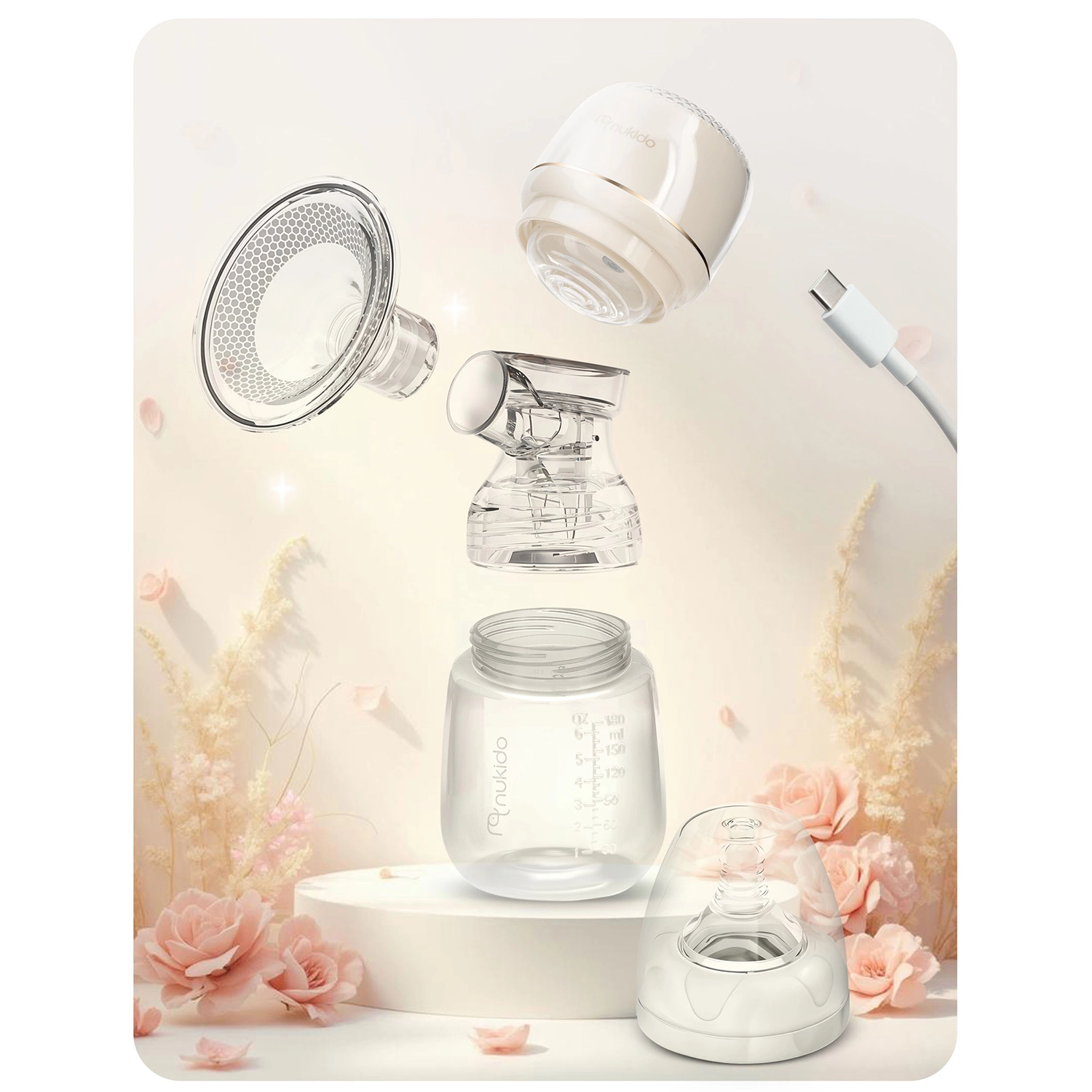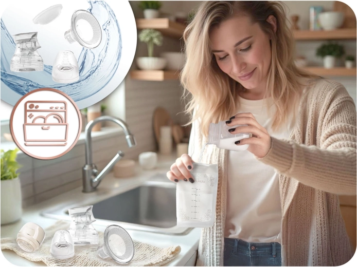 Součástí je láhev 180 ml s dynamickým dudlíkem, který tvarově připomíná mateřský prs a podporuje správnou techniku sání, aby se neporušila laktace. Většinu částí lze mýt v myčce (mimo elektrický panel), použité materiály jsou antibakteriální a bez BPA. Kompaktní rozměry a tichý chod dělají z této odsávačky ideální volbu pro domov, práci i cestování.