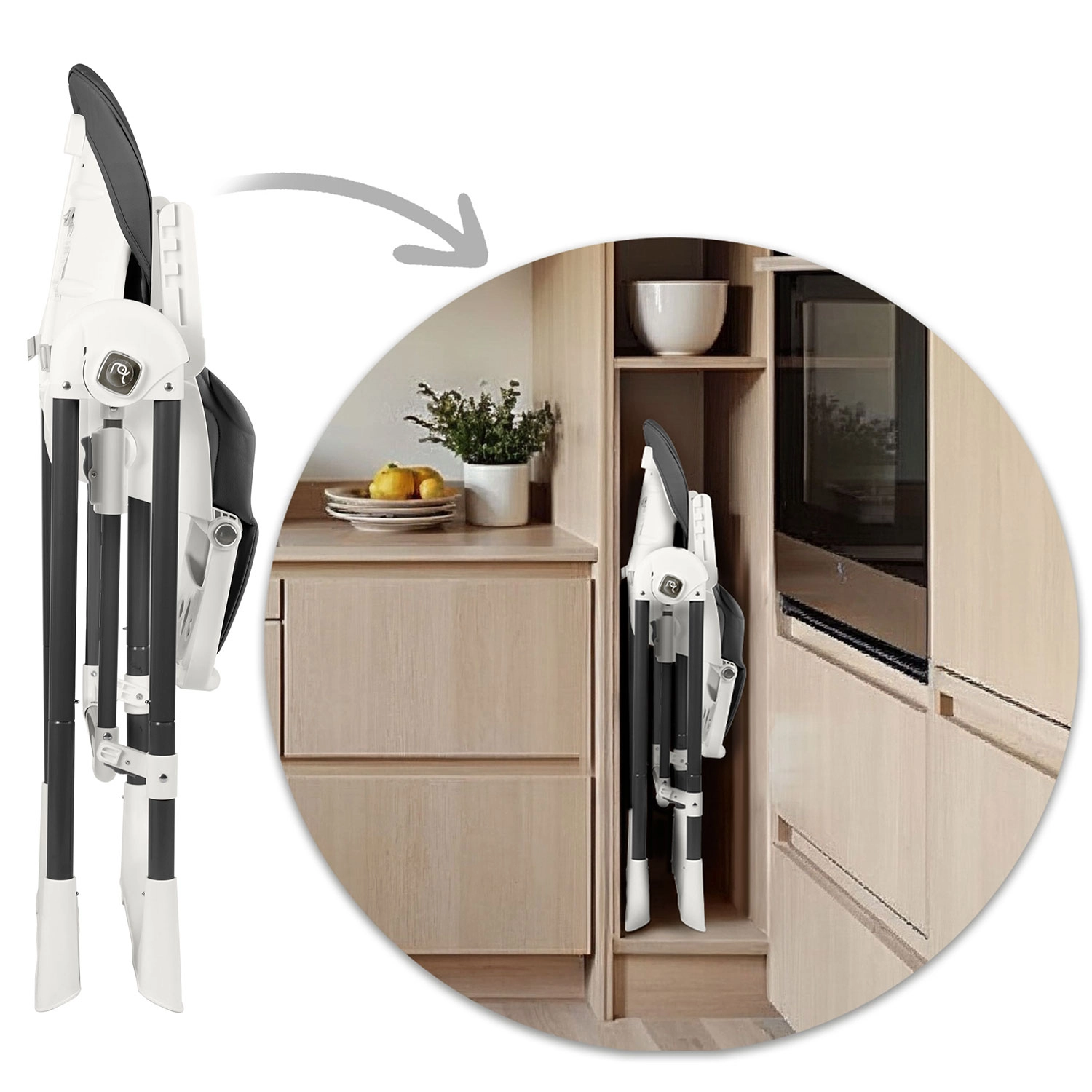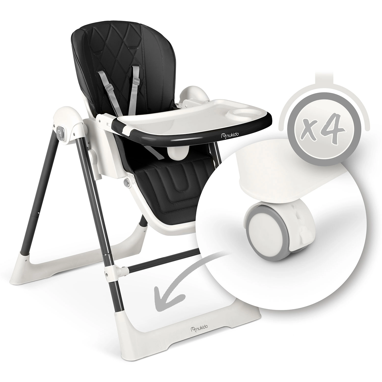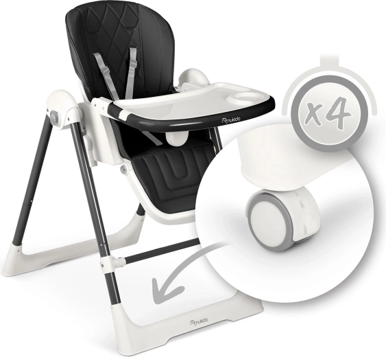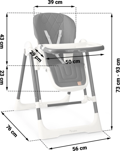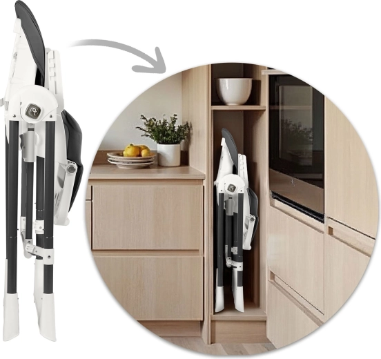 Praktická odnímatelná tác s horní vložkou jde rychle sejmout a opláchnout, potah z měkkého materiálu se jednoduše otírá. 5bodové pásy drží dítě bezpečně, široké nohy s protiskluzovými koncovkami zajišťují stabilitu. Po jídle židličku snadno složíte do úsporných rozměrů a díky kolečkům ji bez námahy přesunete tam, kde ji právě potřebujete.