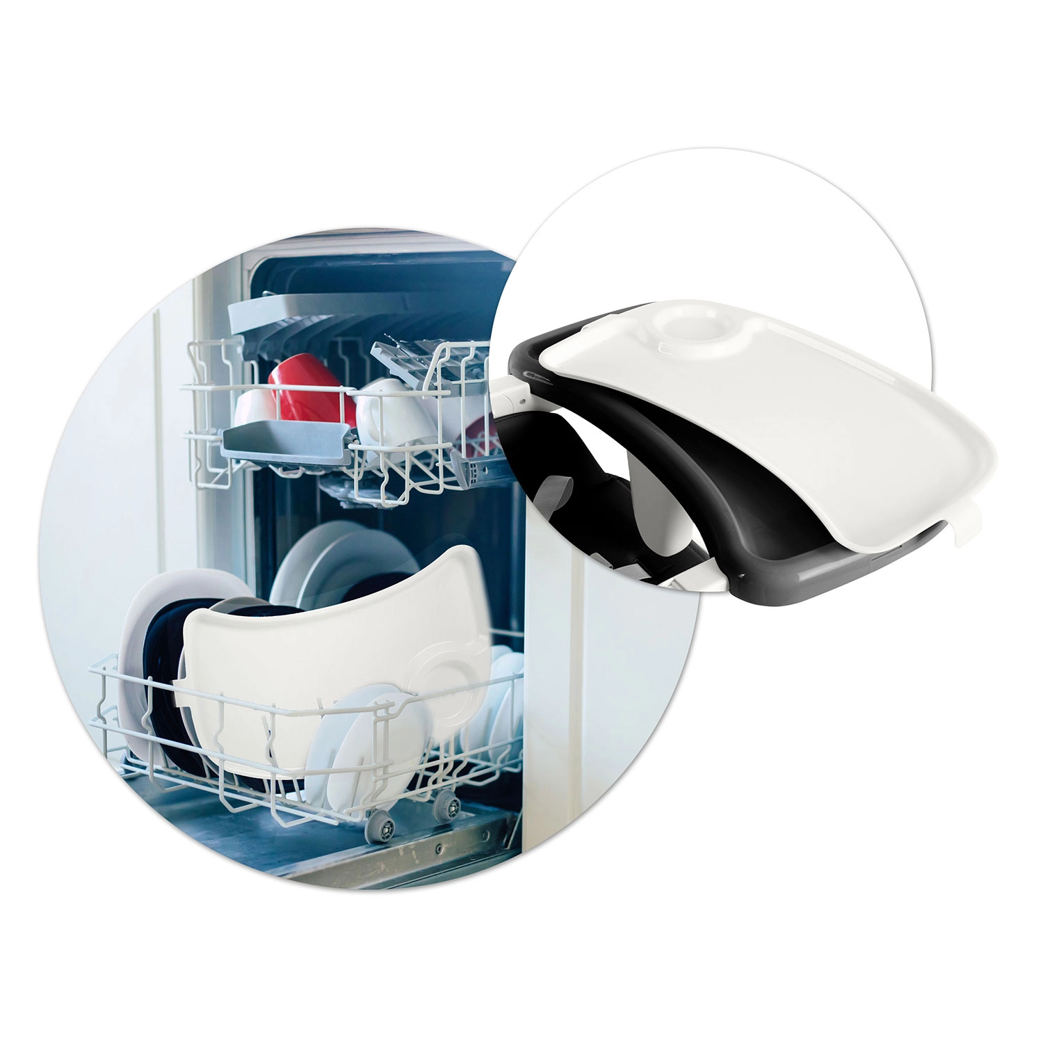 Horní vložku tácu lze sejmout a opláchnout, potah neabsorbuje nečistoty – vše stačí otřít a židlička je během chvilky zase čistá.