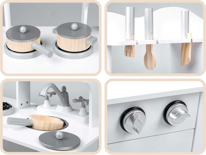 Díky vyjímatelnému dřezu je údržba i hra s vodou snadná a zábavná, zatímco magnetická dvířka a zaoblené hrany zvyšují bezpečnost. Praktické police a háčky poskytují mnoho místa na ukládání doplňků. Kuchyňka je vyrobena s důrazem na detail a splňuje bezpečnostní normy EN.