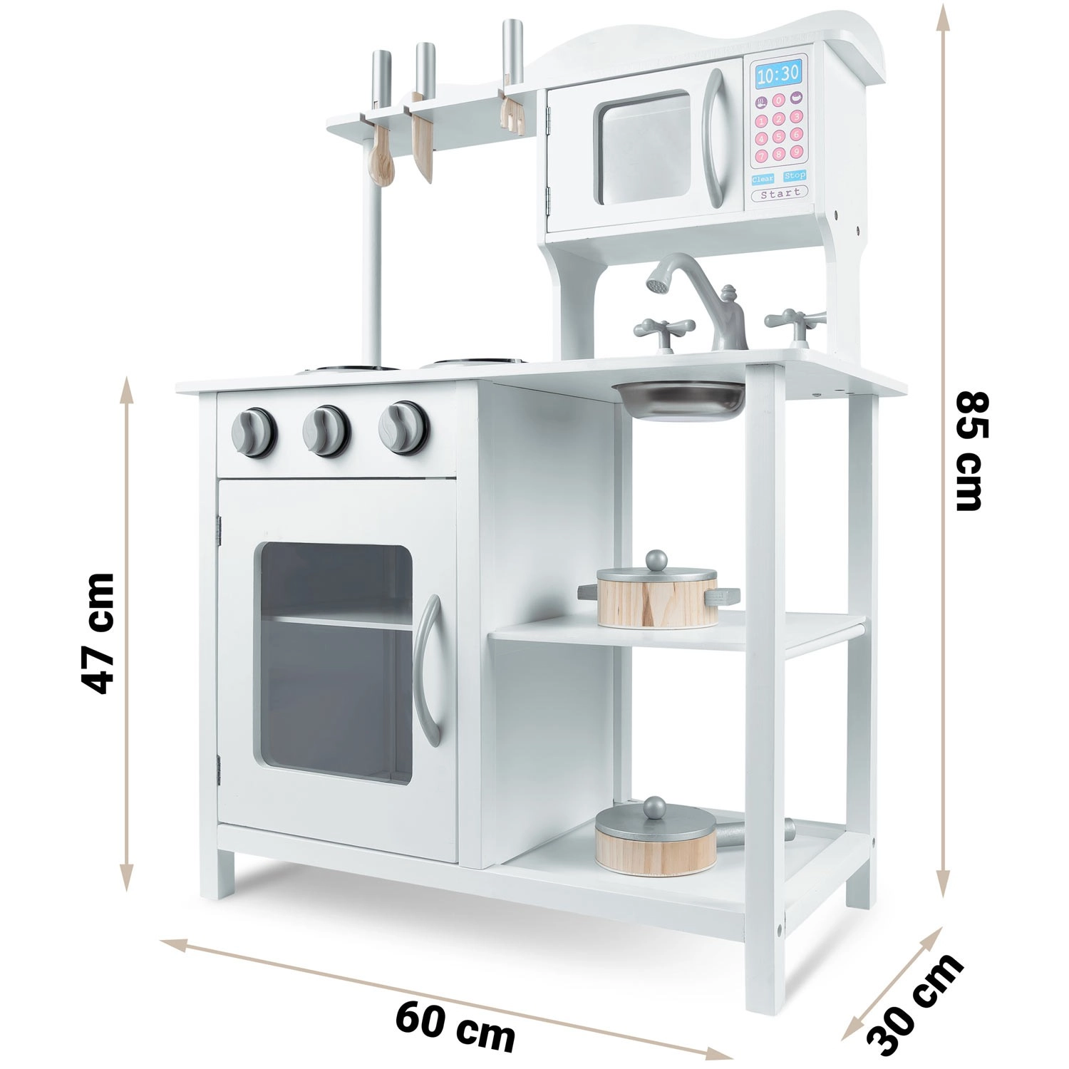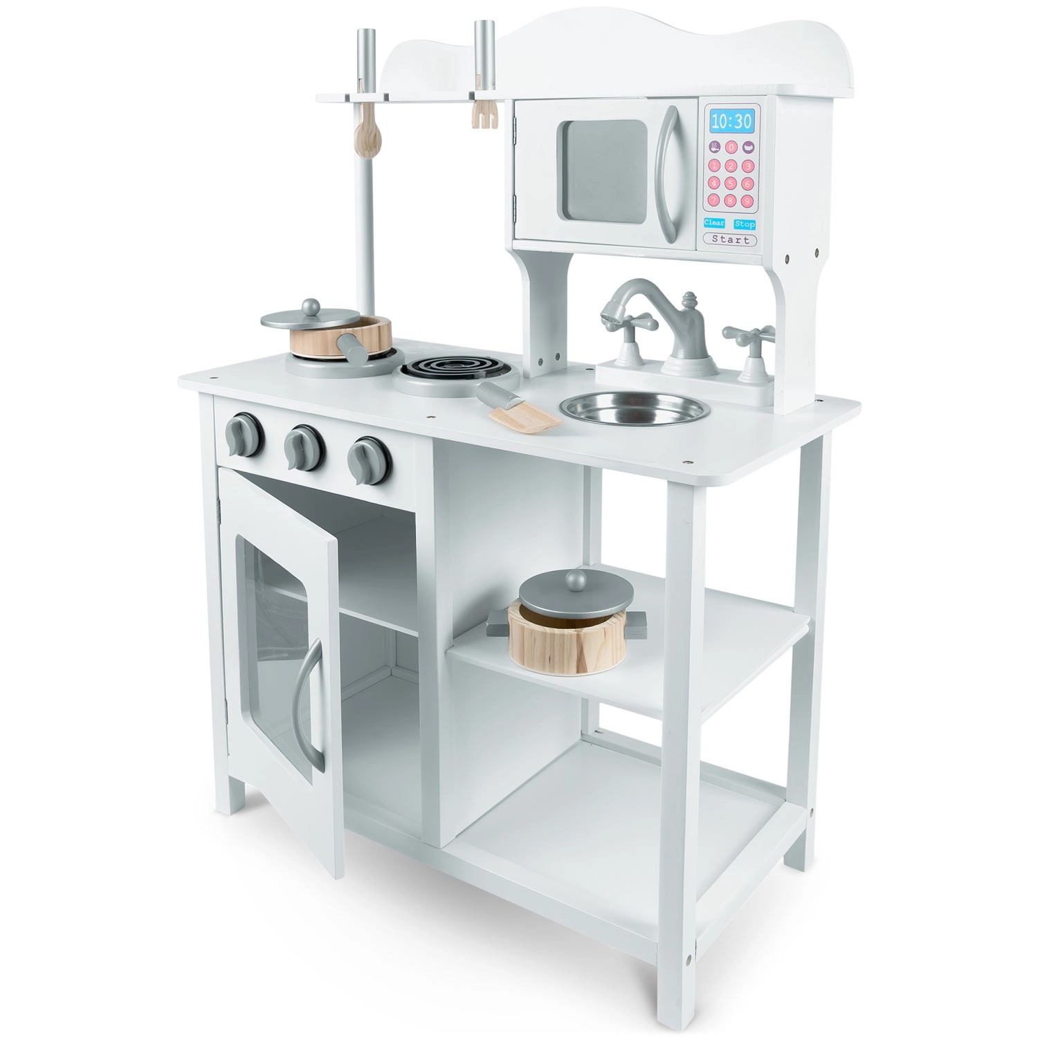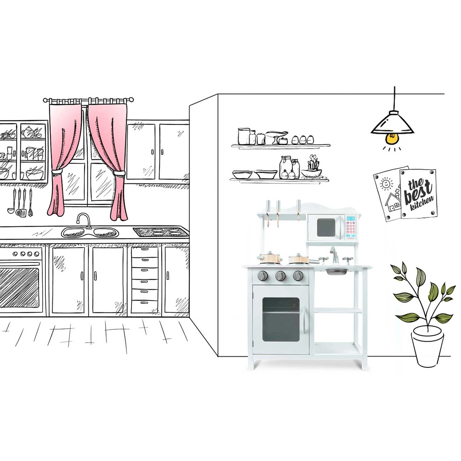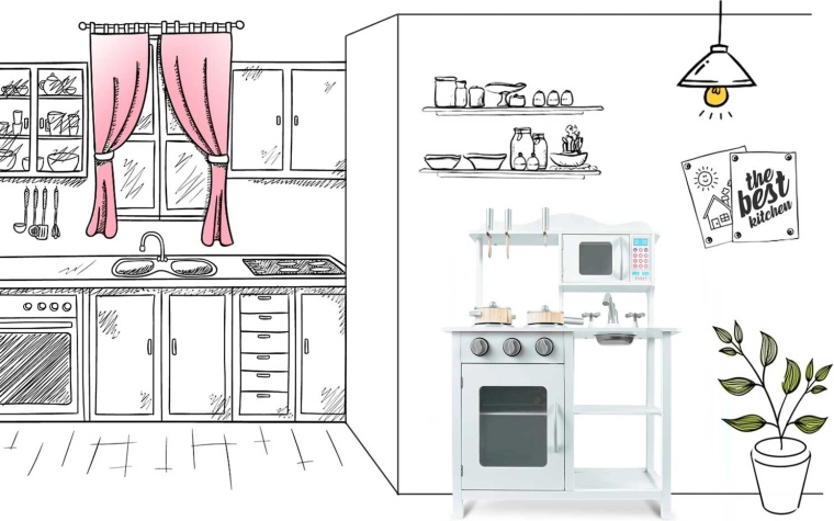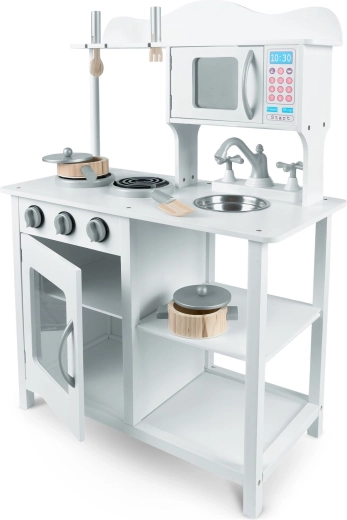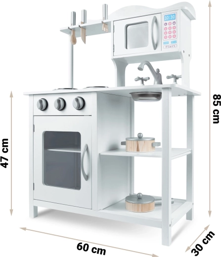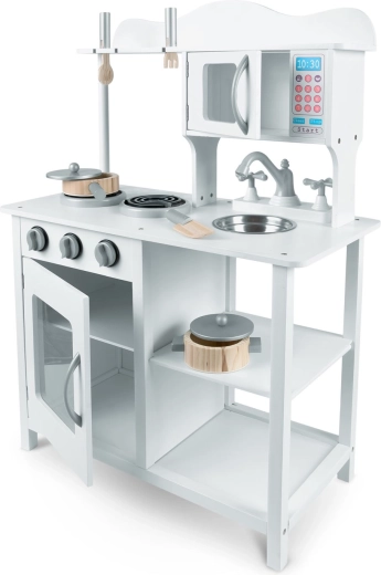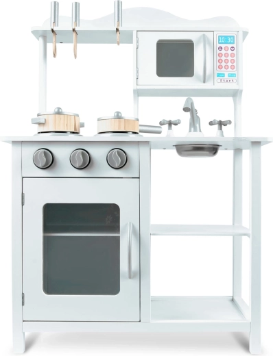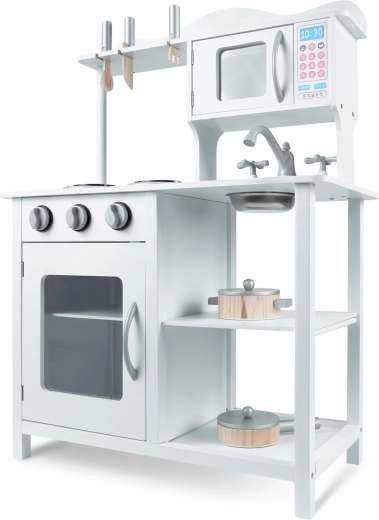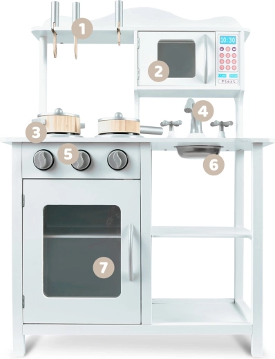 Tato stylová kuchyňka z dřeva v univerzální bílé barvě se perfektně hodí do každého dětského pokoje. Realistické prvky jako hořáky s otočnými knoflíky, mikrovlnná trouba s barevným panelem a trouba s policí podporují napodobivou hru a učí děti základům vaření a organizace.
