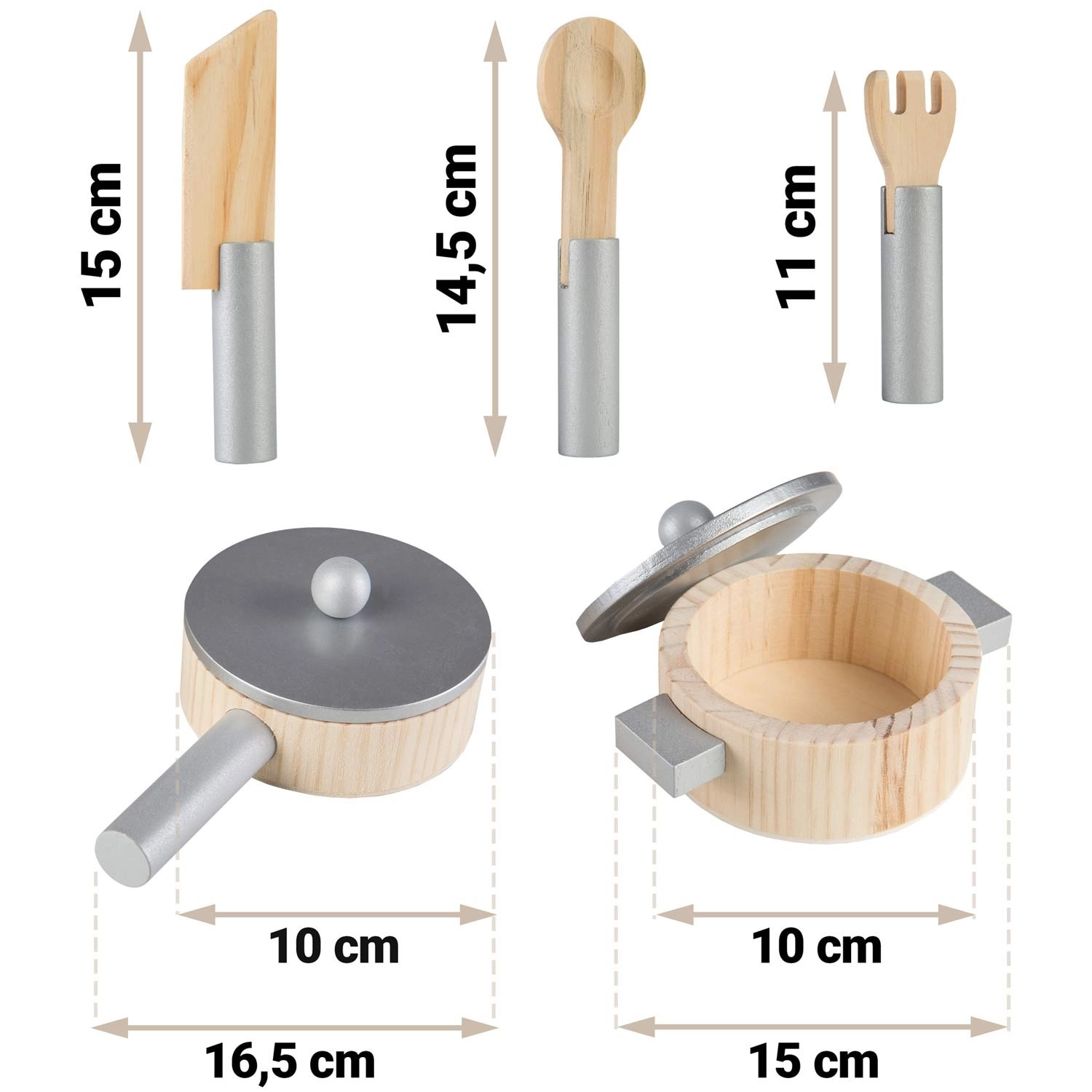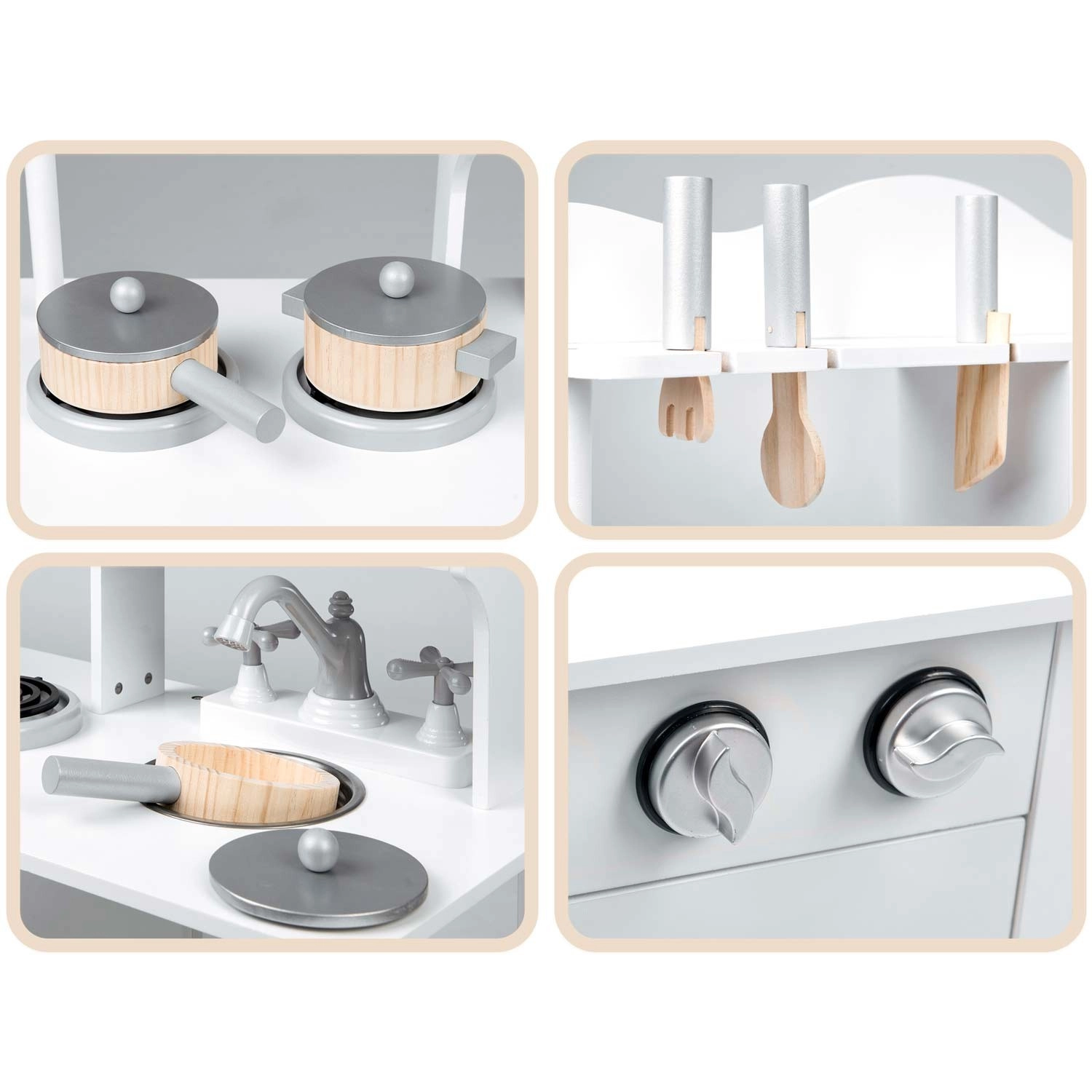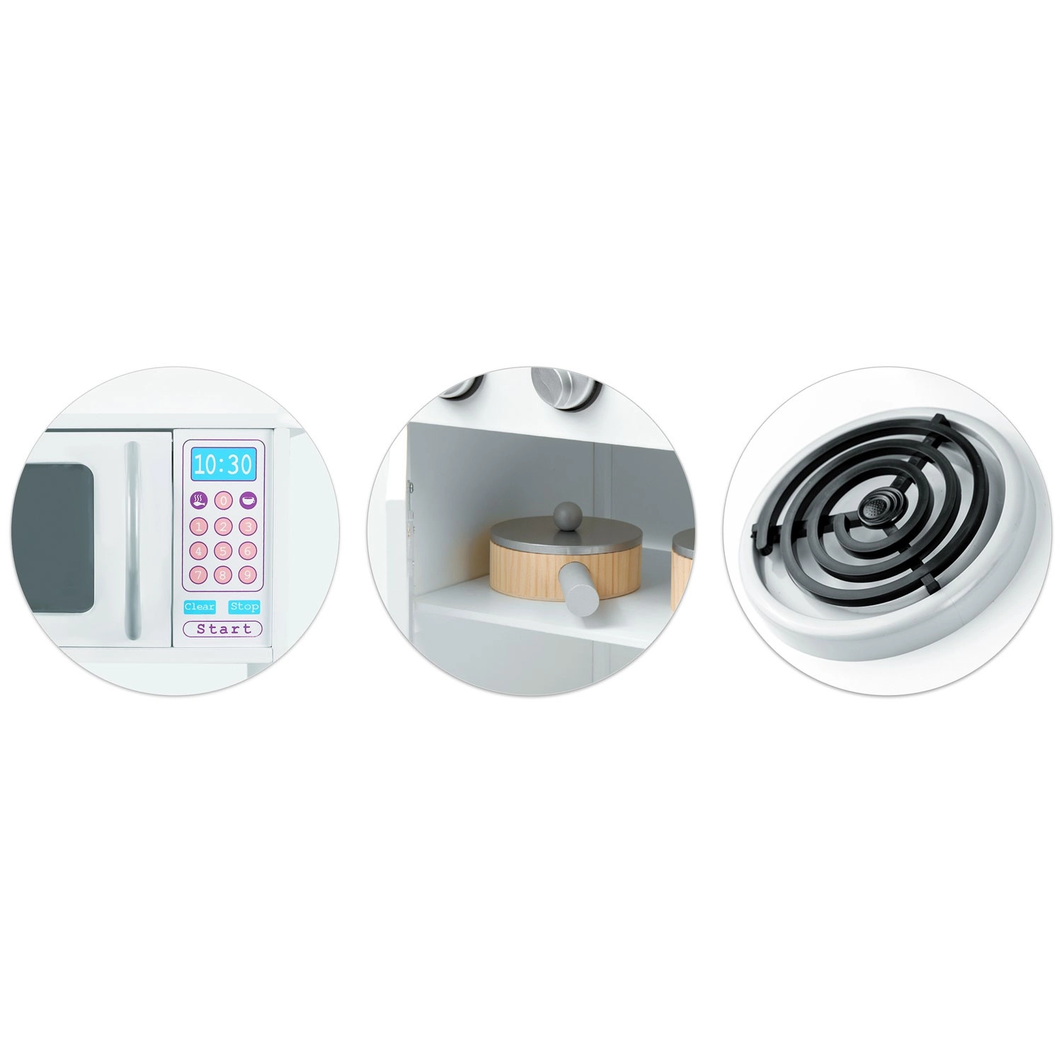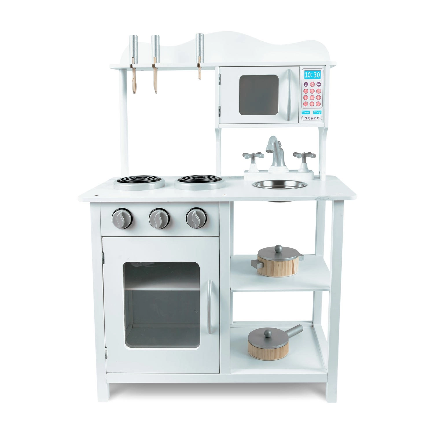 Tato stylová kuchyňka z dřeva v univerzální bílé barvě se perfektně hodí do každého dětského pokoje. Realistické prvky jako hořáky s otočnými knoflíky, mikrovlnná trouba s barevným panelem a trouba s policí podporují napodobivou hru a učí děti základům vaření a organizace.