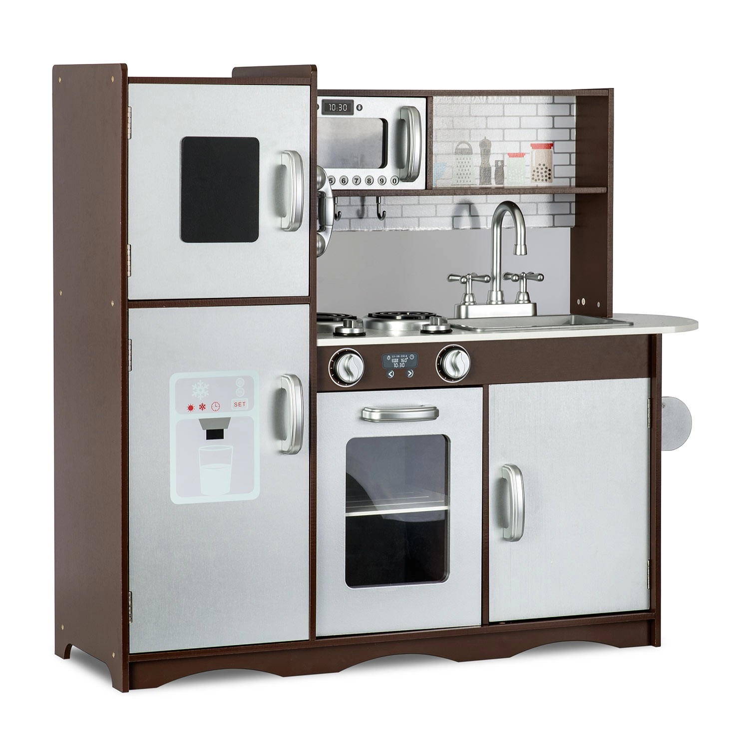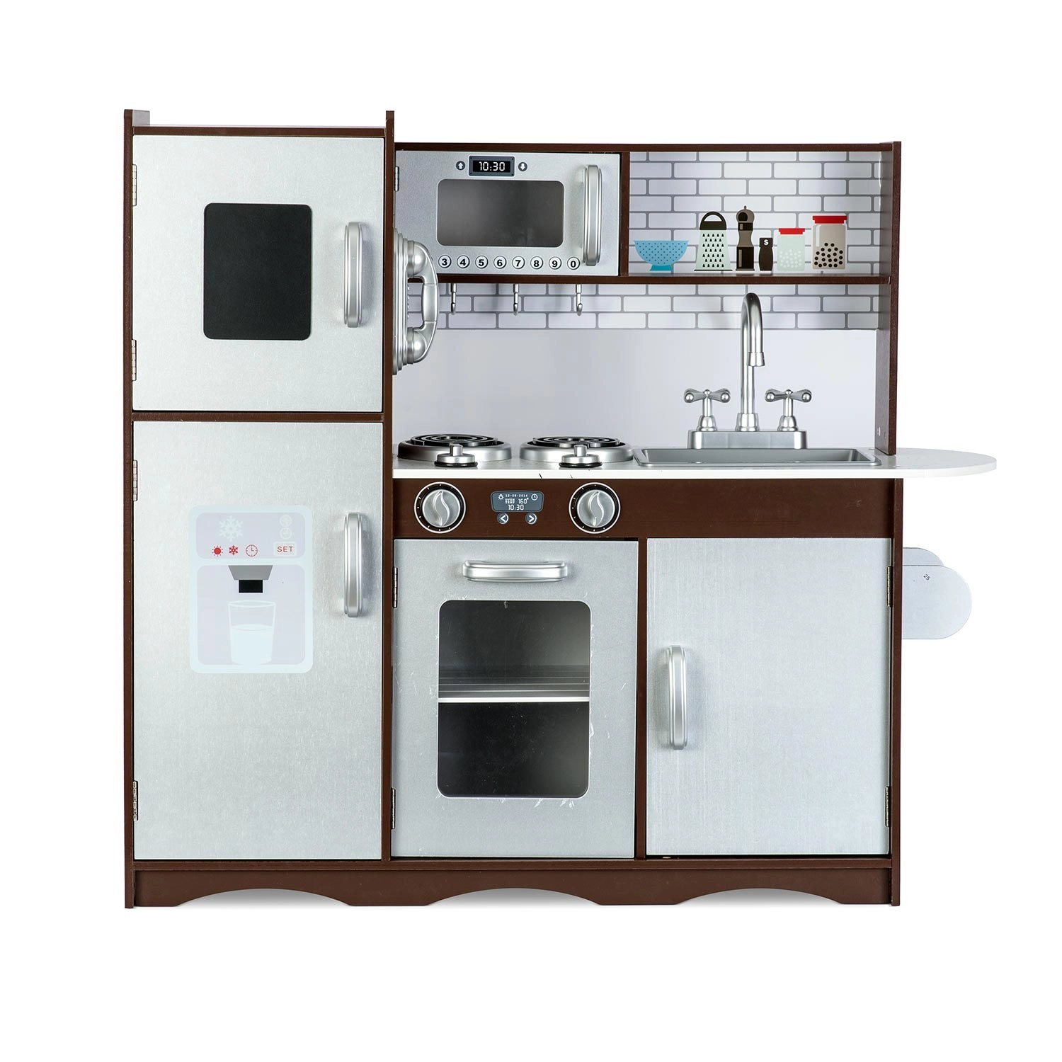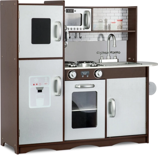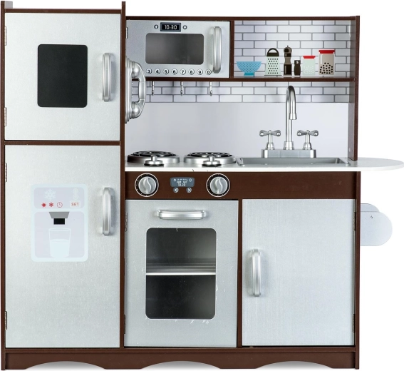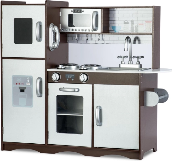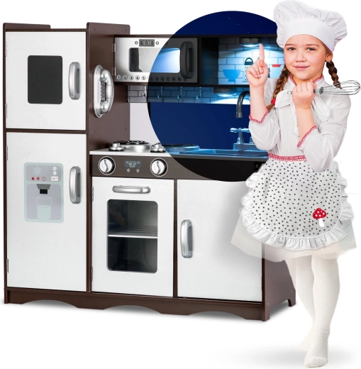 Tato dřevěná kuchyňka v retro stylu promění dětský pokoj v malou restauraci. Děti si užijí realistickou hru díky funkčním prvkům, jako jsou otevírací dvířka lednice, mrazáku a trouby, otočné knoflíky sporáku či dřez s vyjímatelnou miskou a otočnou baterií. Přehledné police, háčky a skříňky poskytnou dostatek místa pro uložení příslušenství.